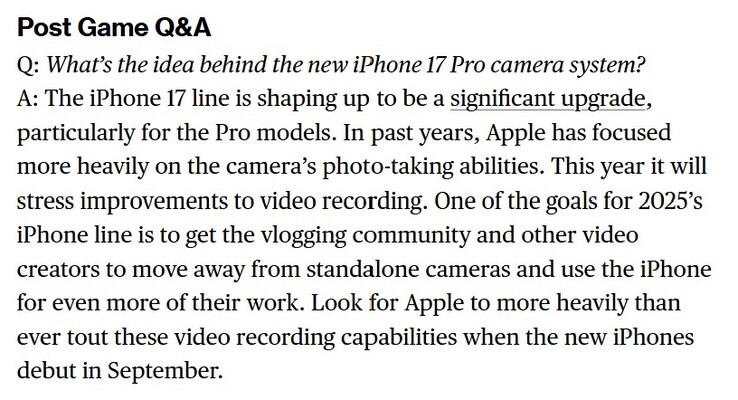 Em seu boletim informativo semanal Power On, o confiável analista Mark Gurman mencionou que o sistema de câmera do iPhone 17 Pro será voltado para vloggers e outros profissionais criativos. Portanto, o Apple aparentemente planeja melhorar a qualidade do vídeo para atrair os cineastas para longe das câmeras dedicadas e para o novo iPhone.