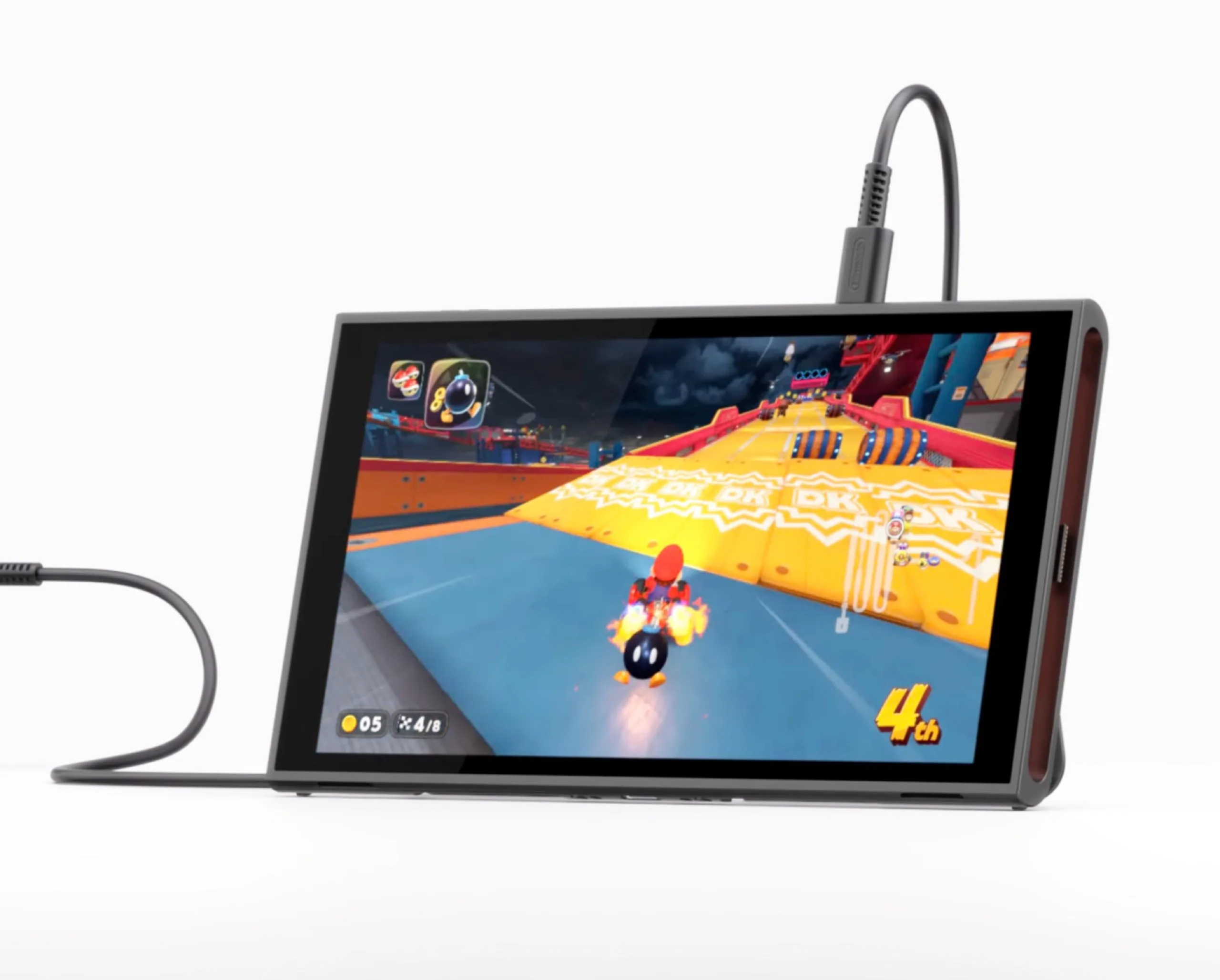 No modo acoplado, isso se traduziria em 3,9 TFLOPs, o que significa que o console híbrido seria tão rápido quanto o Xbox Series S. De acordo com a Nvidia, o chip tem núcleos RT e Tensor dedicados para traçado de raios acelerado por hardware e DLSS, o último dos quais permite o aumento de escala com IA para resoluções mais altas. Além disso, os núcleos Tensor permitem que a câmera do Nintendo Switch 2 rastreie o rosto do usuário e o isole usando IA. Outra informação nova é que o Switch 2 é compatível com VRR no modo portátil, de modo que a taxa de atualização da tela pode ser ajustada para corresponder ao FPS do jogo, a fim de evitar o rompimento da tela.