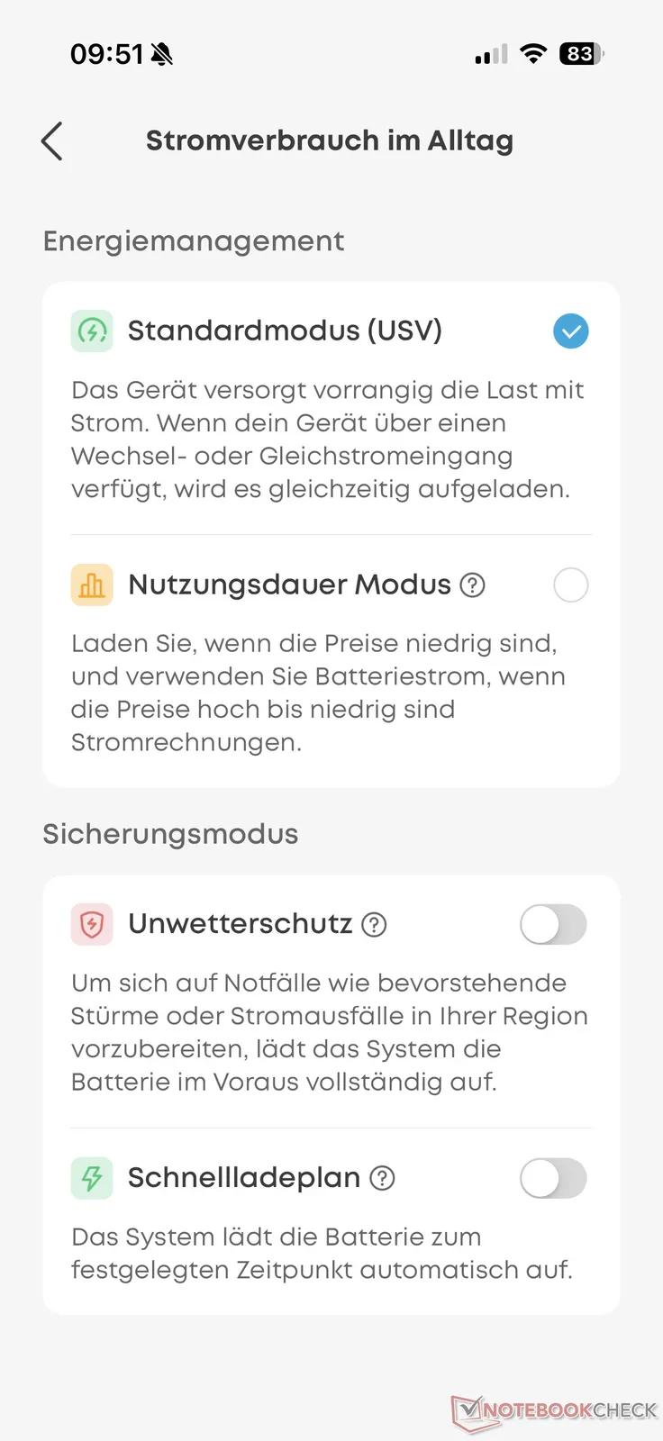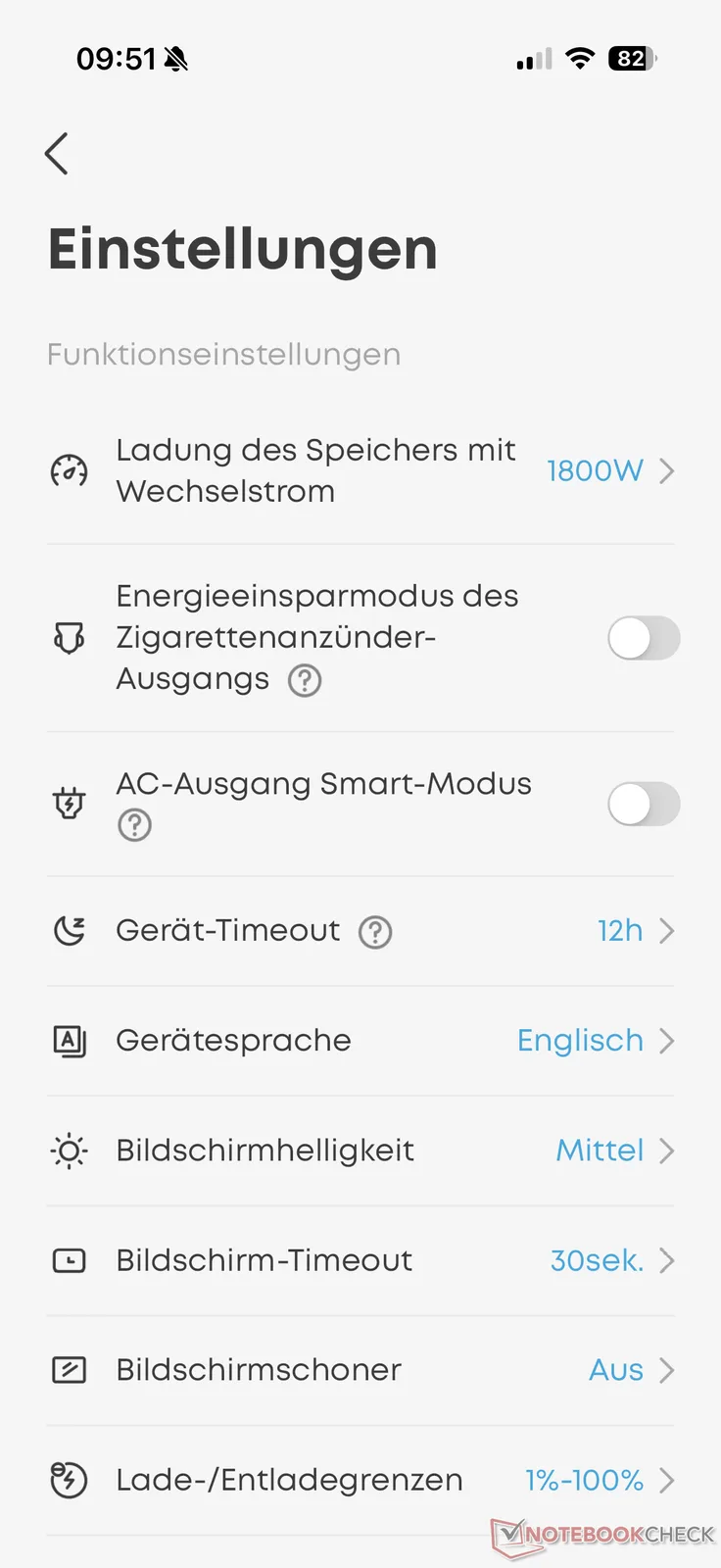 Há também várias configurações relacionadas à velocidade de carregamento, limites de carga e descarga, opções de economia de energia, opções de exibição e muito mais. Graças à nova tela, algumas das configurações agora também podem ser alteradas diretamente na estação de energia. Além disso, duas telas fornecem informações mais detalhadas sobre os valores de desempenho atuais.