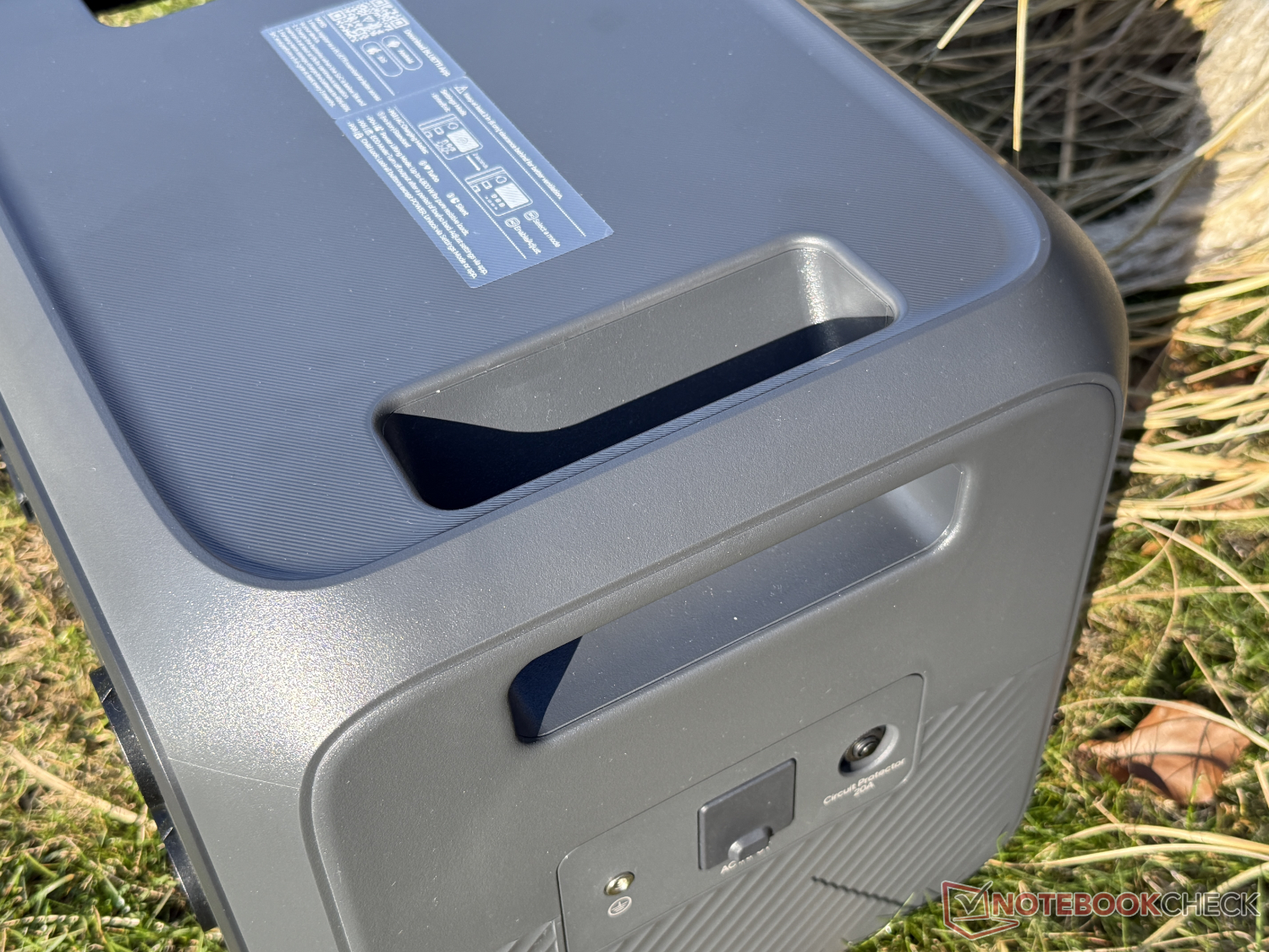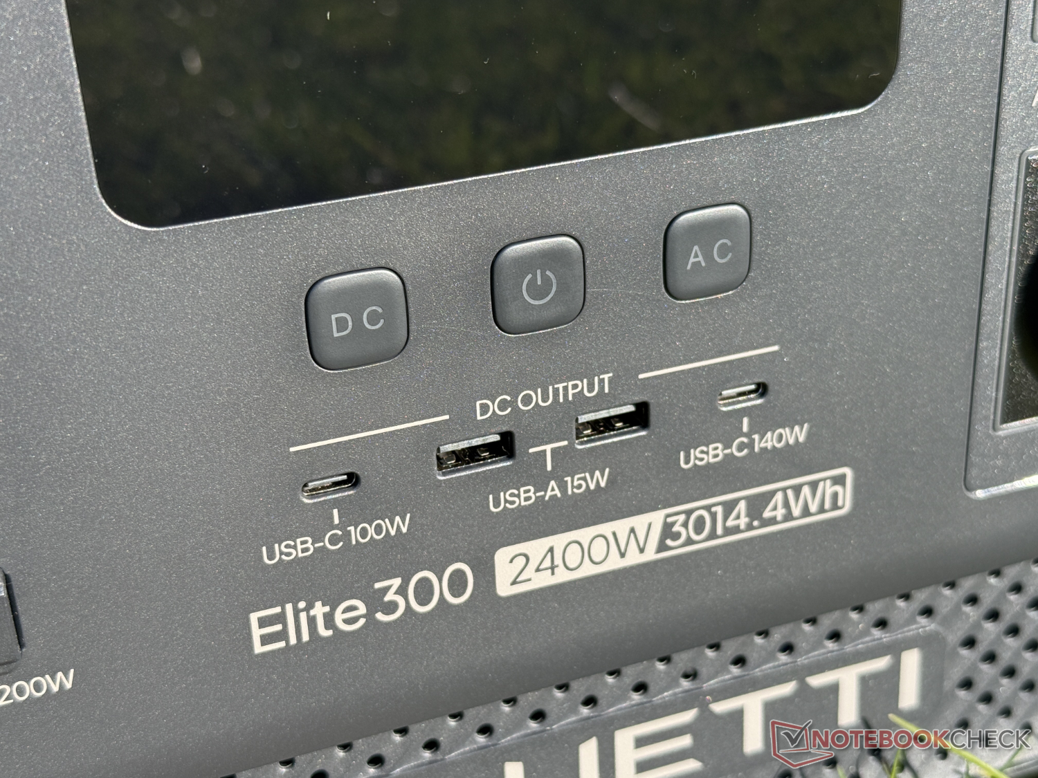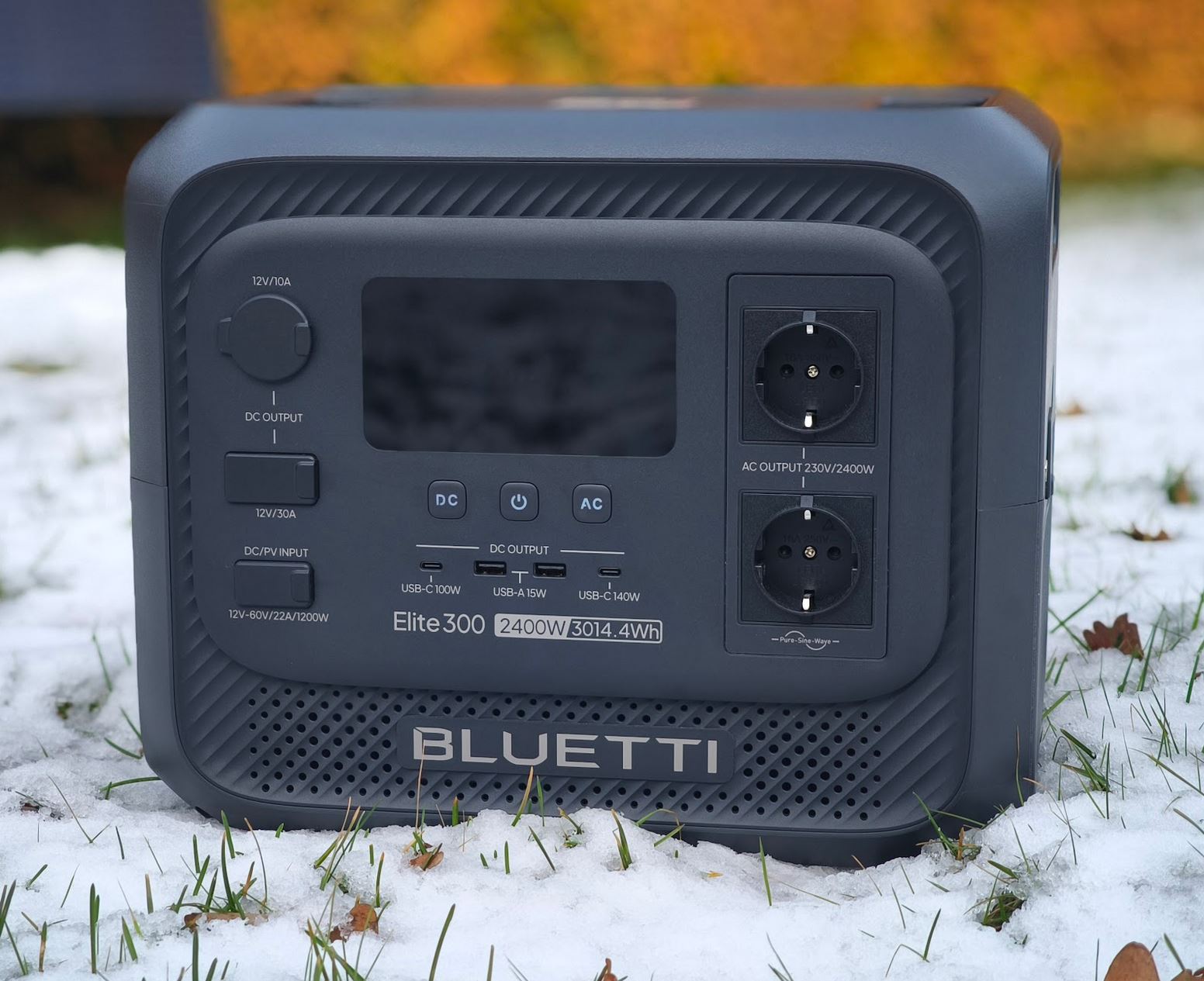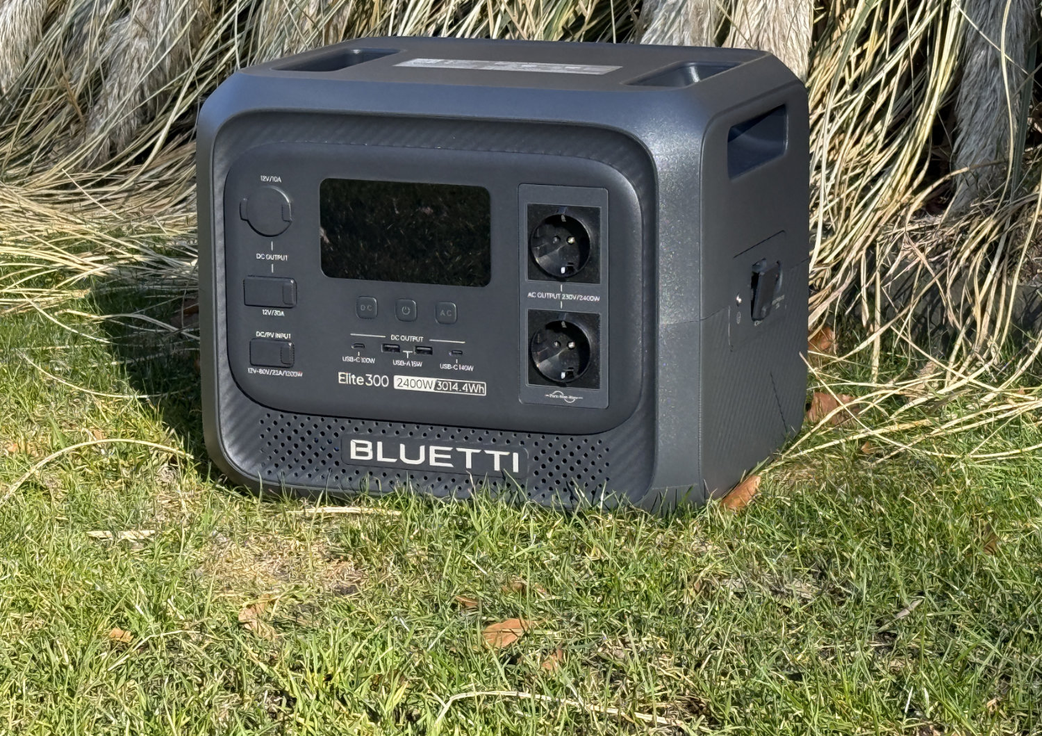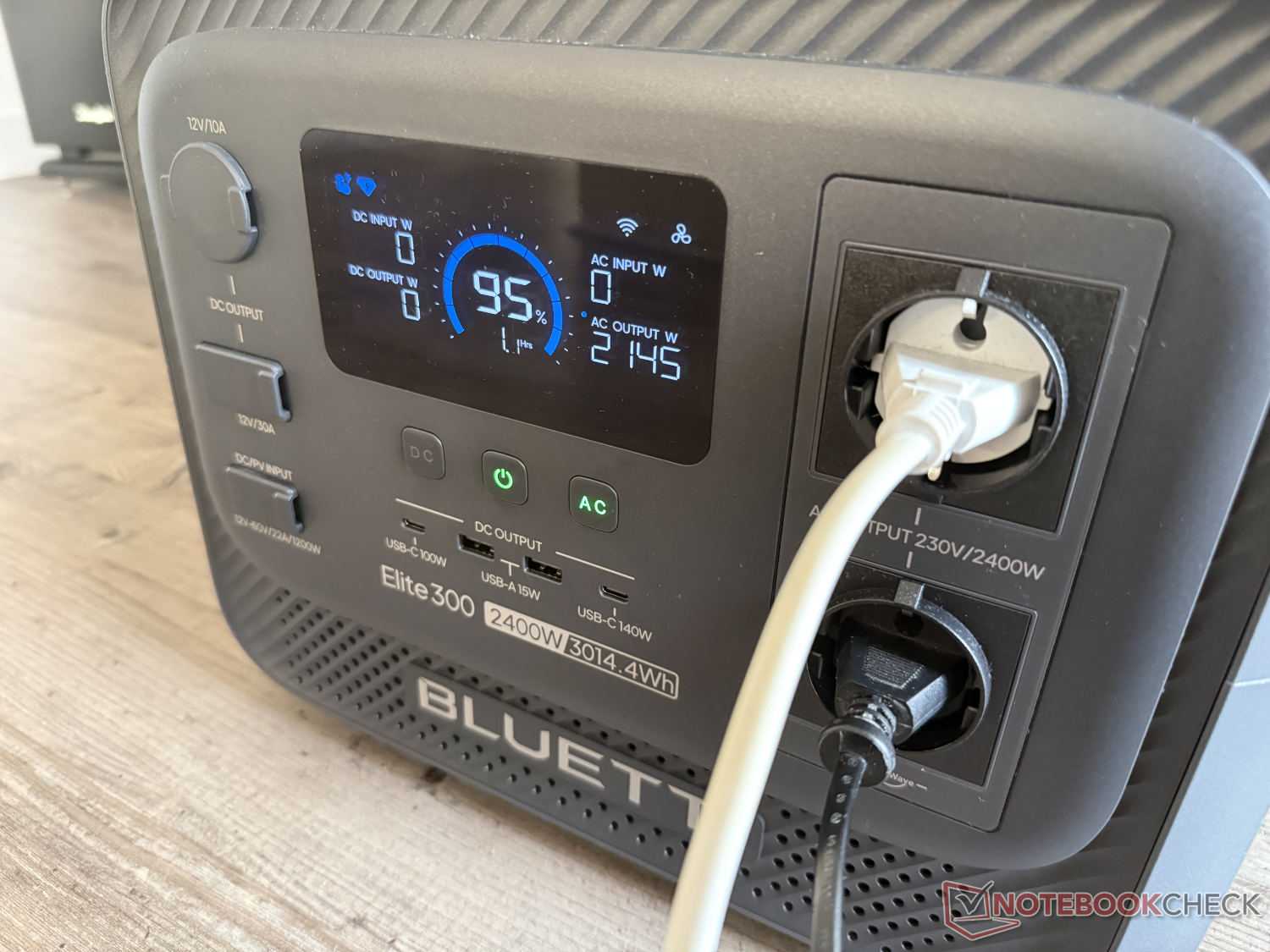 A potência de saída CA é de 2.400 W a 230 V, que pode ser aumentada para até 4.800 W por períodos curtos. Além de duas tomadas CA, há quatro portas USB (duas USB-A com 15 W, uma USB-C com 100 W e uma USB-C com 140 W), uma tomada para carro de 12 V (tomada de acendedor de cigarros) com um máximo de 120 W e uma conexão CC com 12 V e 30 A na parte frontal.