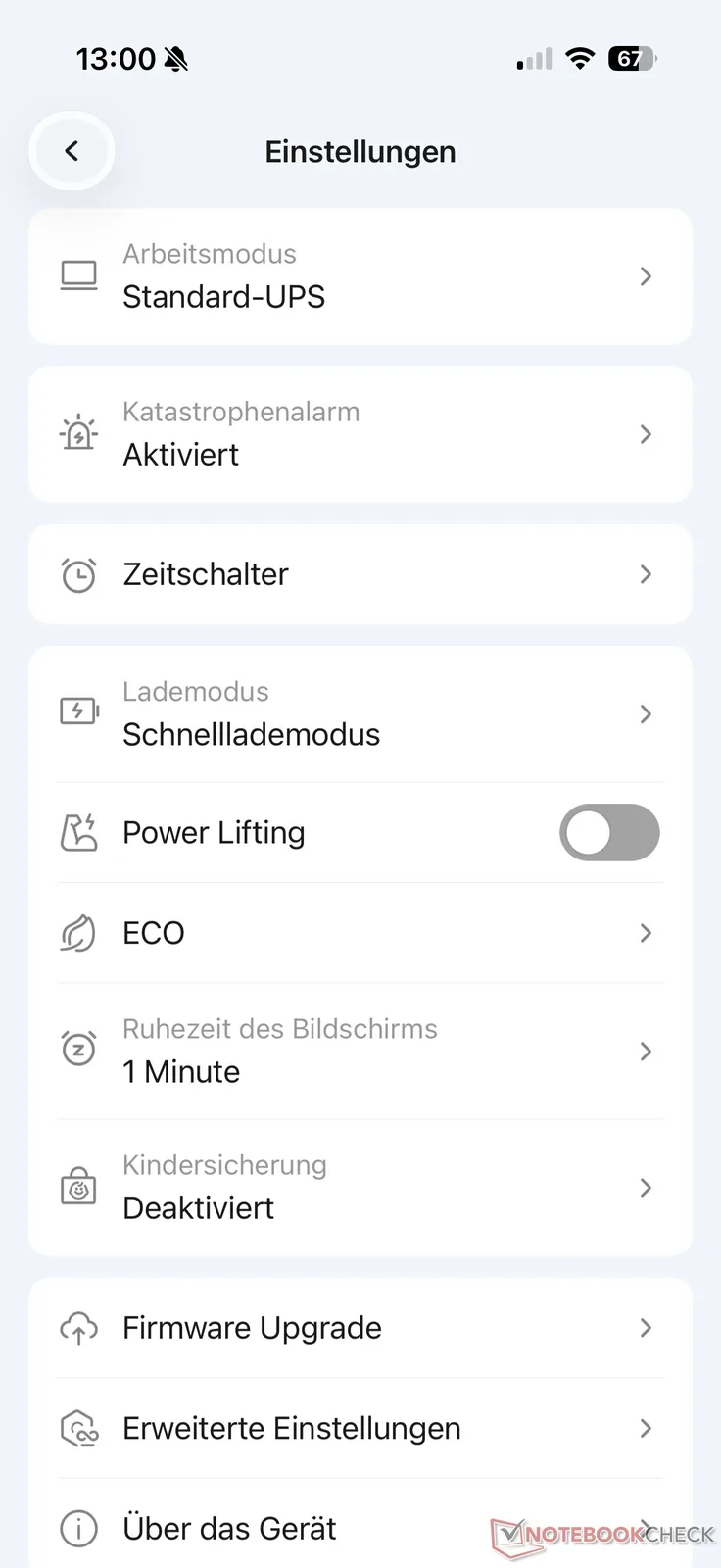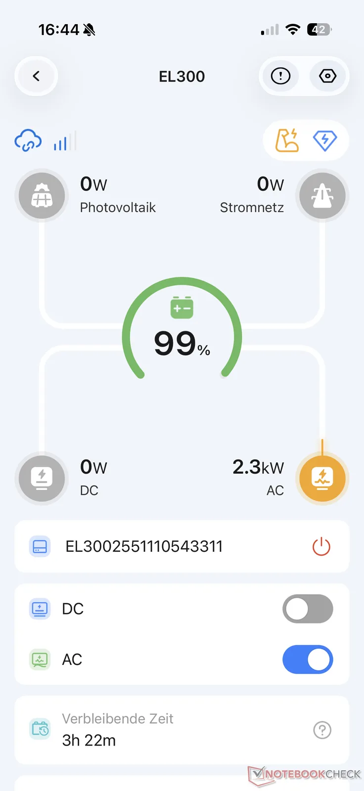 O estabelecimento da conexão funcionou sem problemas durante o teste. A visão geral não mostra apenas os valores atuais de energia durante a carga e a descarga. As portas AC e DC também podem ser ligadas e desligadas. O aplicativo também mostra a vida útil restante da bateria para a carga atual.