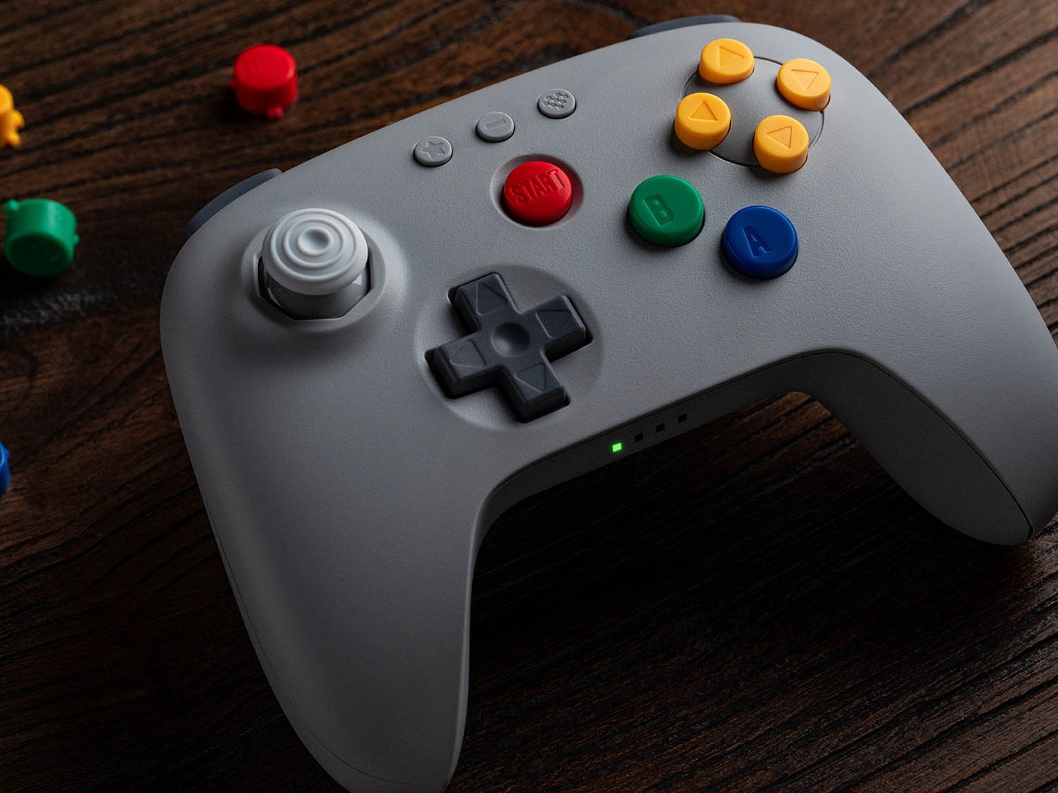 O controle Bluetooth Classic Gray 8BitDo 64 homenageia o controle original do Nintendo 64. Além de ter a mesma cor cinza, ele também tem um botão de início vermelho, botões C amarelos, um botão B verde e um botão A azul. O D-Pad é cinza escuro, como os botões de ombro, enquanto a tampa do joystick é cinza claro.