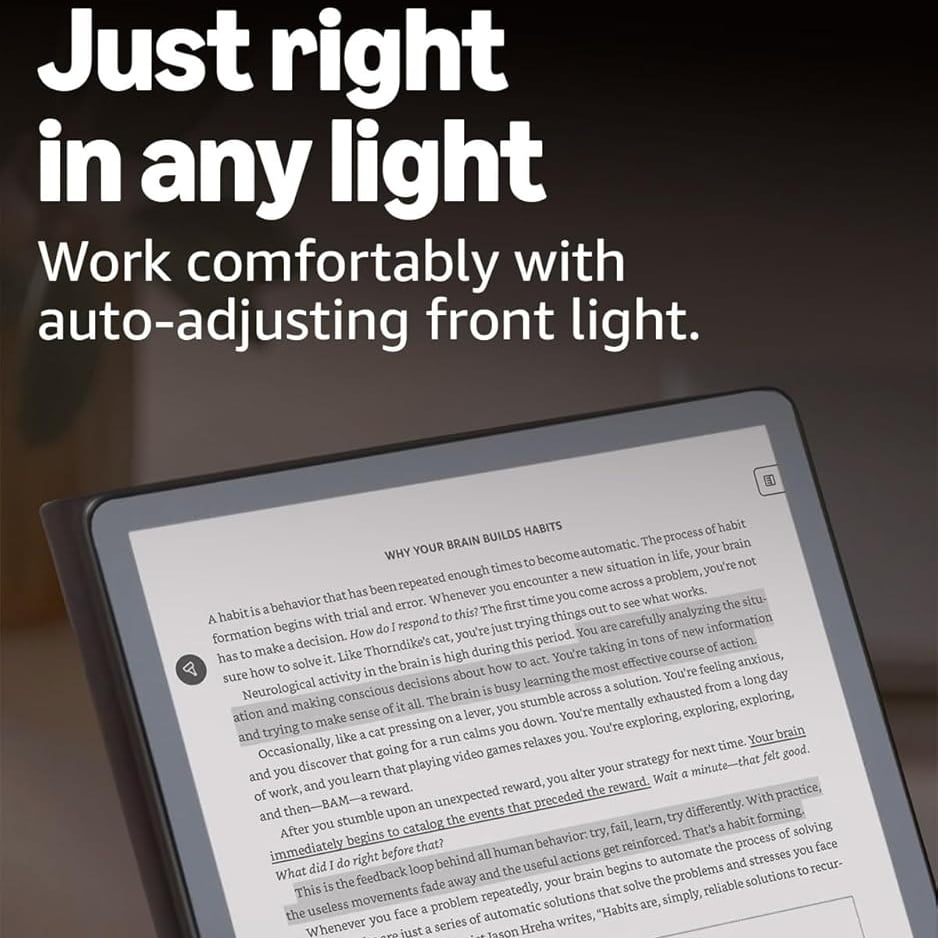 A Amazon diz que essa nova tela sem brilho espelha uma folha de papel tanto em tamanho quanto na experiência de escrita. O modelo com a luz frontal também tem um sistema de iluminação aprimorado e um novo vidro moldado com textura que melhora o atrito ao escrever com a caneta premium redesenhada. Além disso, a Amazon diz que conseguiu reduzir a paralaxe a quase nada, para uma melhor experiência de escrita.