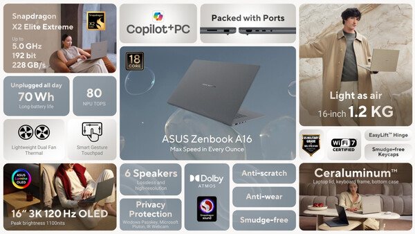Embora o foco continue no lançamento do laptop nos EUA, a Asus também começou a vender o Zenbook A16 internacionalmente. Por exemplo, o laptop já pode ser comprado na Austrália, na zona do euro e no Reino Unido. Atualmente, todas as variantes apresentam um processador Snapdragon X2 Elite X2E-94-100 48 GB de RAM e um SSD de 1 TB.