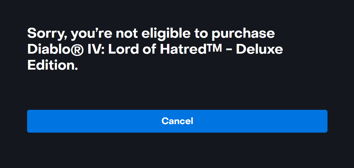 Diversos usuários (inclusive eu) em Reddit, Battle.net, Xe em praticamente todas as plataformas não conseguem comprar a expansão imediatamente. Inicialmente, os usuários foram recebidos por uma mensagem "Sorry, you're not eligible to purchase Diablo IV: Lord of Hatred - Deluxe Edition" no cliente Battle.net. O cliente até mudou de moeda aleatoriamente no meio do processo. No momento em que este artigo foi escrito, a situação não parece ter melhorado.