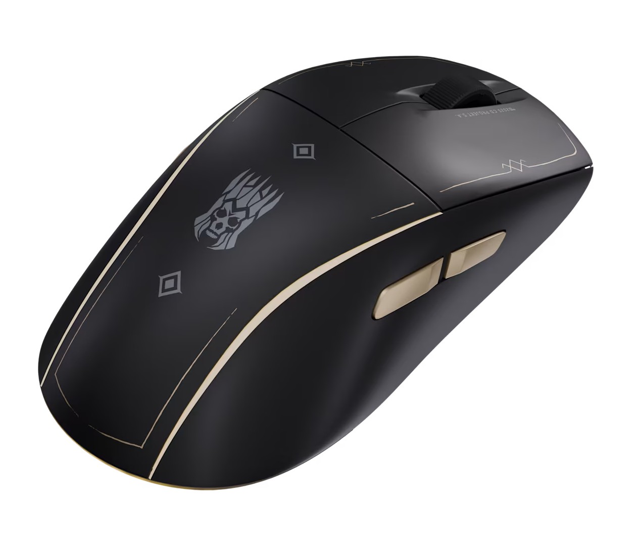 O Corsair M75 Wireless Gaming Mouse Witcher 3: Wild Hunt 10th Anniversary Edition tem botões dourados nas laterais e motivos inspirados no mundo de Witcher. Há também um símbolo de Eredin Bréacc Glas, o Rei da Caçada Selvagem, no mouse.