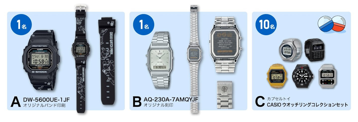 Os prêmios incluem um DW-5600UE-1JF com uma pulseira impressa especial (um ganhador), um AQ-230A-7AMQYJF com gravação original (um ganhador) e conjuntos de coleções de brinquedos em cápsulas de relógios Casio para dez ganhadores. A elegibilidade dependerá da disponibilidade de IDs da Casio na região dos usuários; não foram anunciadas restrições específicas por país.
