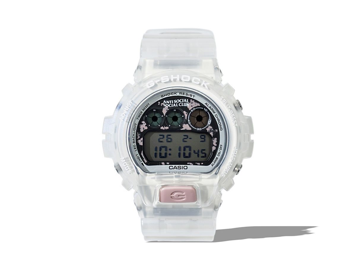 O novo G-Shock x Anti Social Social Club DW-6900 é um relógio esqueleto com uma luneta translúcida, revelando uma caixa branca abaixo. Ela envolve um mostrador preto com um padrão de flor de cerejeira rosa claro, com um botão "G" rosa combinando. A pulseira transparente é decorada com flores e borboletas cor-de-rosa, o popular design Kkotch da marca. Além disso, quando os usuários iluminam a luz de fundo de LED, as palavras "Get Weird" são exibidas no fundo do visor digital maior.