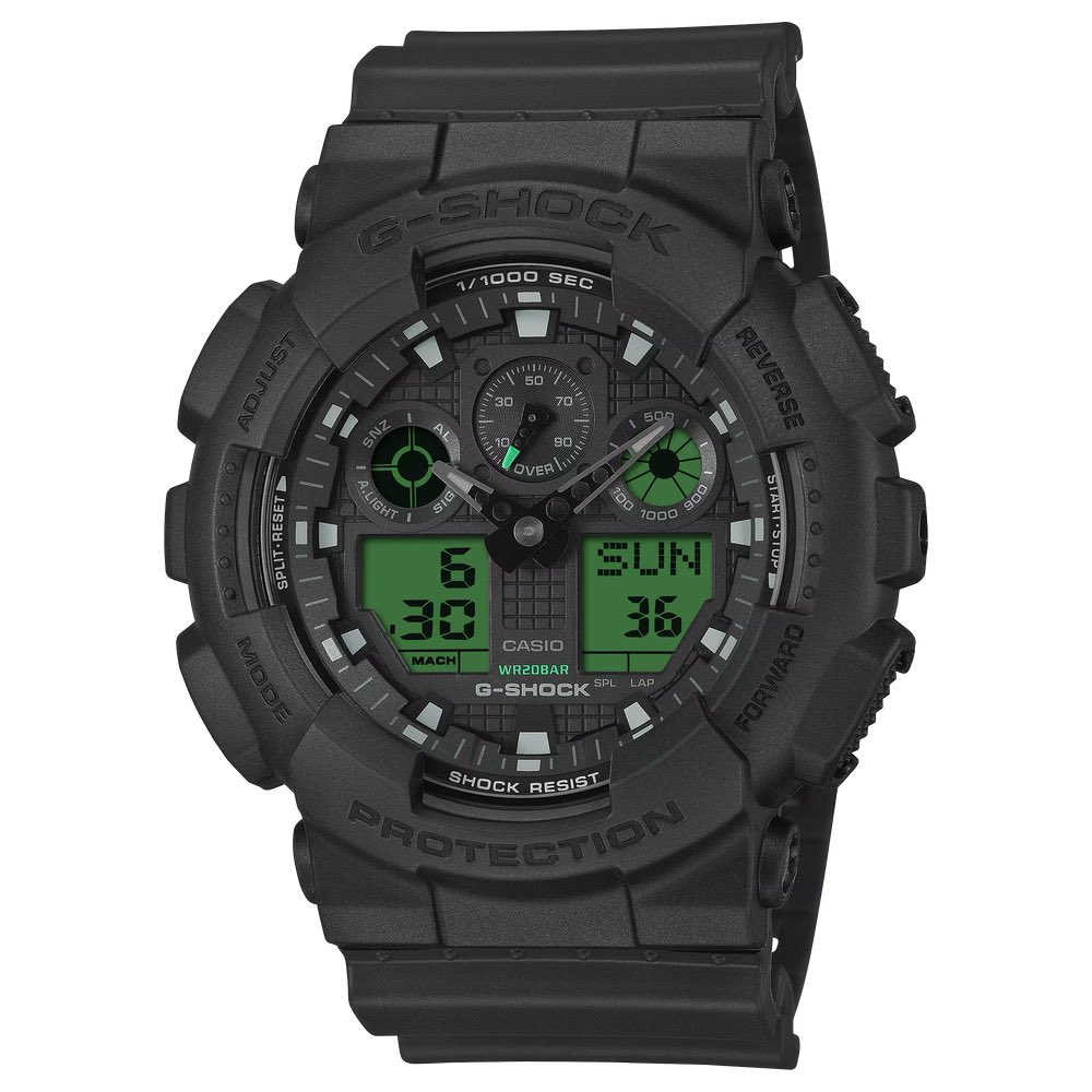 O próximo é o GA-100BEG-1A (¥18.700). Esse modelo digital-analógico robusto apresenta o layout clássico de gráfico triplo da Casio, utilizando dois painéis LCD eletro-verdes na parte inferior para contrastar efetivamente com a caixa preta discreta. Ele apresenta ponteiros e submostradores com ponta verde, combinando uma estética mecânica com uma robusta resistência antimagnética JIS Classe 1 e uma bateria com duração de dois anos.