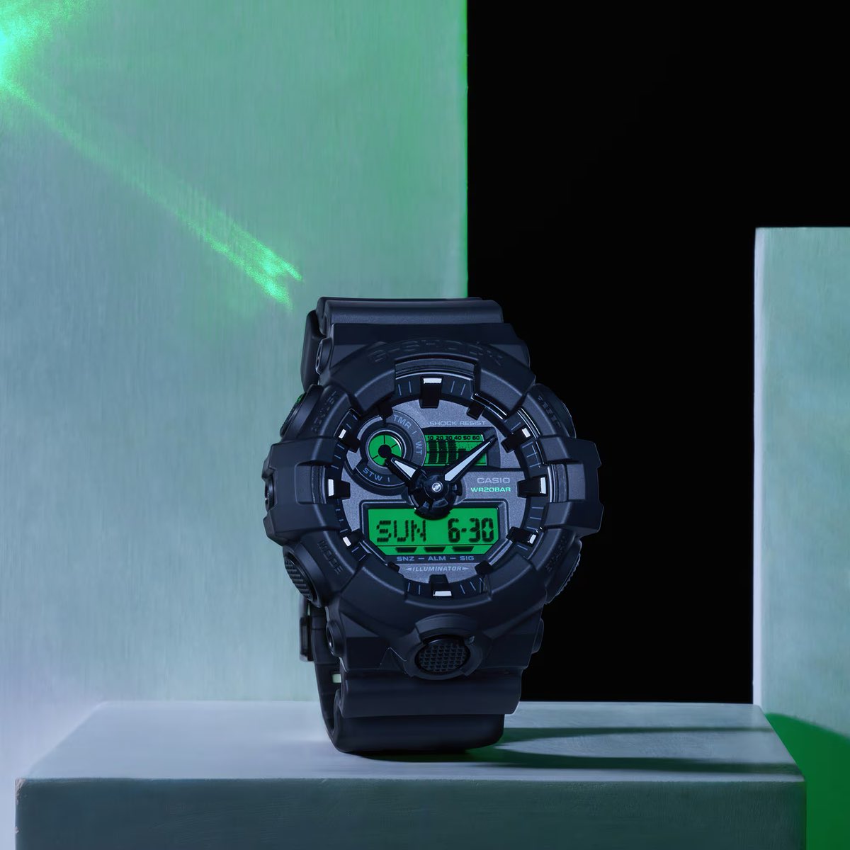 Oferecendo uma silhueta visivelmente mais arrojada, o GA-700BEG-1A apresenta para-choques de resina agressivos e um botão de luz frontal texturizado proeminente. Em vez de telas de duas seções, ele utiliza um único LCD eletro-verde limpo, combinado com grandes ponteiros 3D e um subdial circular. Ele não possui proteção antimagnética, mas tem uma bateria de cinco anos. Seu preço é de ¥18.700, o mesmo do GA-100BEG.