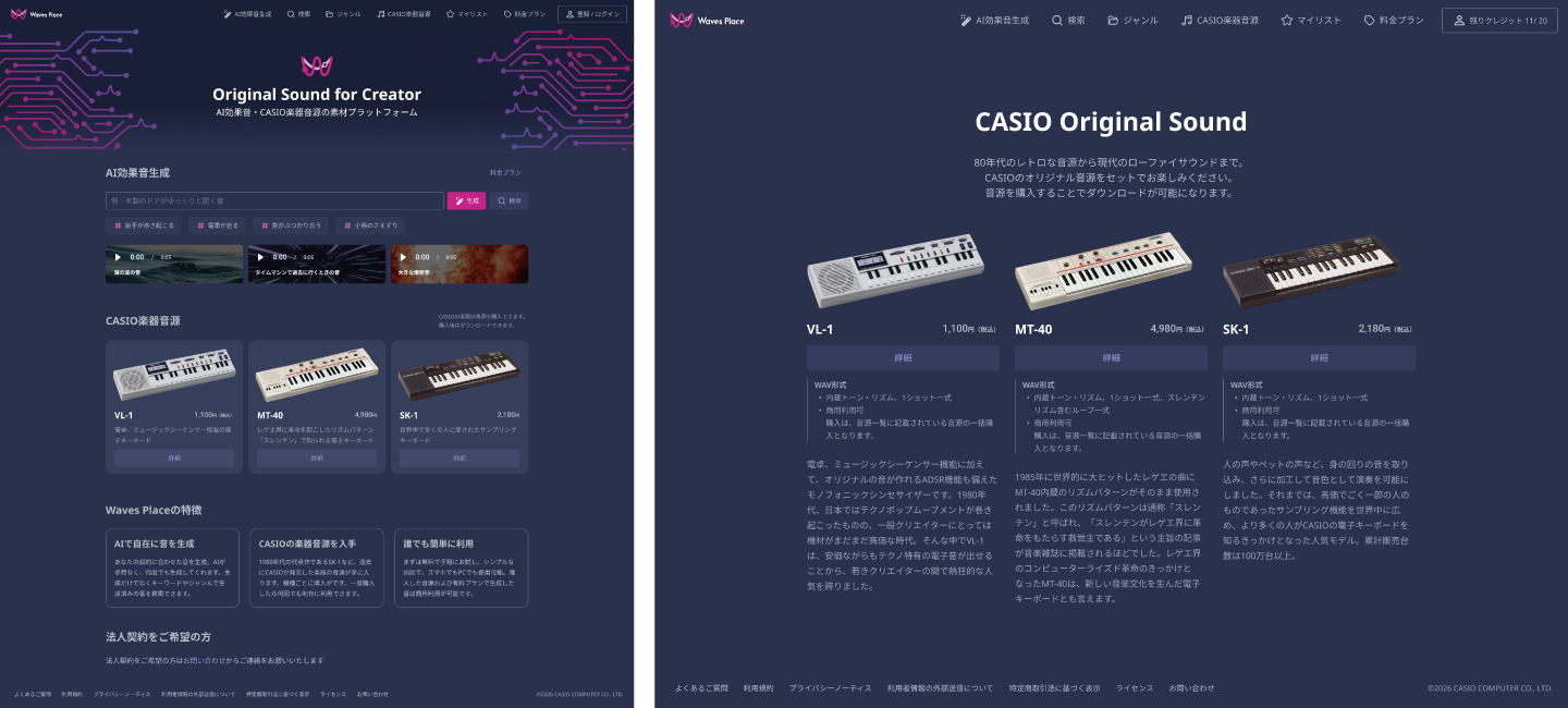 A Casio Computer Co., Ltd. começou a vender fontes de som oficiais de três de seus teclados eletrônicos clássicos dos anos 80 por meio do Waves Place, um serviço de geração de efeitos sonoros de IA. Os novos lançamentos do https://www.casio.co.jp/release/2026/0324-wavesplace/ incluem sons do Casio VL-1, Casio SK-1 e Casio MT-40. Todos os três pacotes foram lançados em 25 de março.