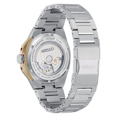 Após o anúncio inicial da coleção reduzida da Série 8 no Japão, a Citizen Europe confirmou uma quarta variante (cortesia de @plus9time's reporting), o NB6084-50A. Esse novo modelo se junta às referências em verde pistache, amarelo-ouro e carbono forjado, já mencionadas anteriormente. Isso efetivamente completa o primeiro lançamento global da arquitetura de 39,3 mm. O NB6084-50A tem uma execução em dois tons. Ele combina uma caixa de aço inoxidável escovado com revestimento de ouro amarelo no bezel e nos elos centrais da pulseira. Como seus equivalentes, a caixa tem apenas 10,4 mm de espessura.