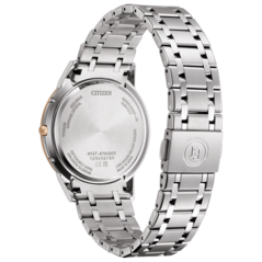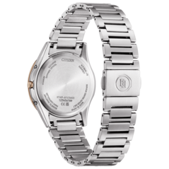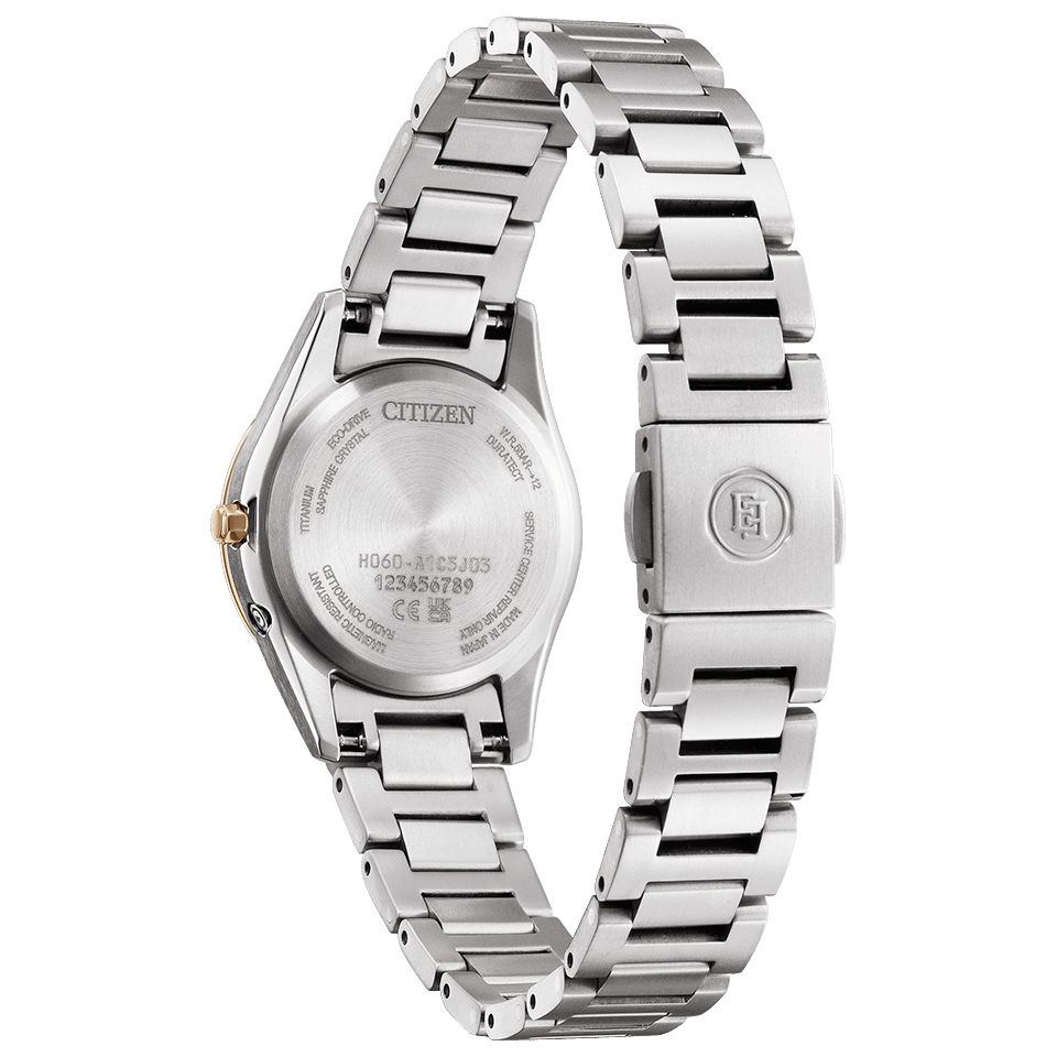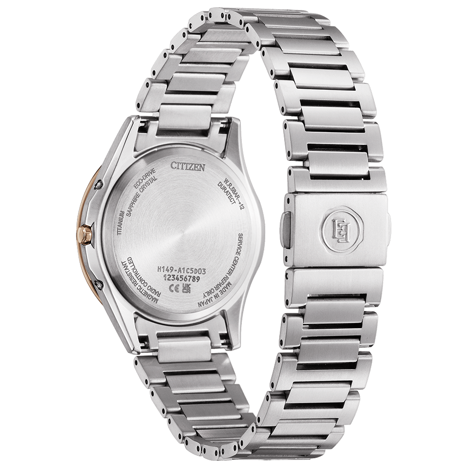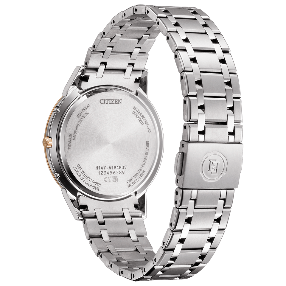 O ES9375-51B é o menor do trio, com 26,6 mm de largura e apenas 7,7 mm de espessura, pesando 34 gramas. Ele funciona com o Calibre H060 e suporta recepção de rádio no Japão, na China, nos EUA e na Europa. A precisão é avaliada em ±15 segundos por mês quando o senhor não está recebendo sinal. A caixa e a pulseira usam Super Titanium com tratamentos de superfície Duratect Platinum e Duratect Sakura Pink - isso dá à moldura um tom sutil de cereja que complementa muito bem o corpo prateado claro. O cristal de safira com revestimento transparente fica na parte superior e a resistência à água é classificada em 5 bar. O preço está fixado em ¥132.000 (~$846).