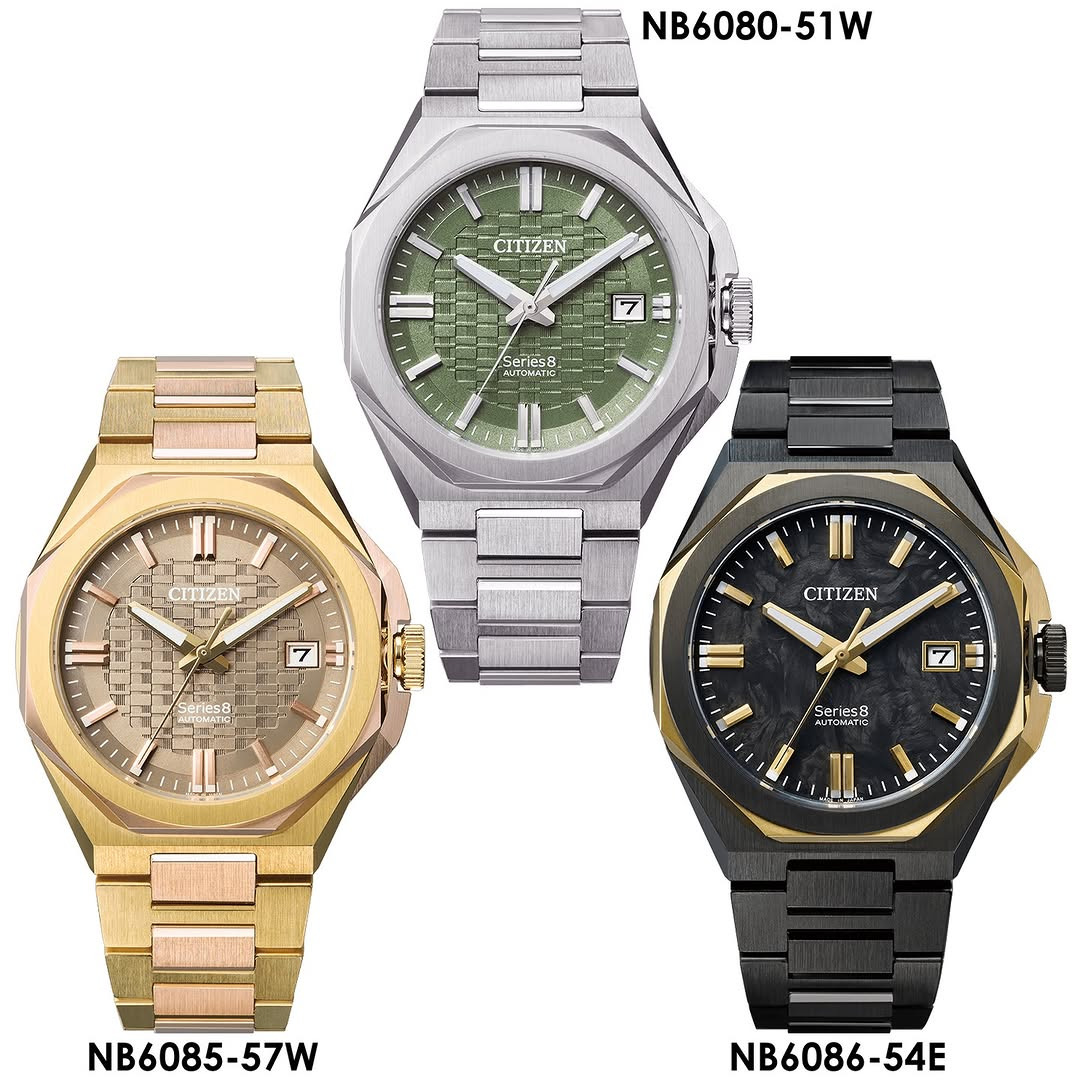 A Citizen está em uma onda de expansão neste momento, ampliando a linha da Série 8 com o lançamento do NB6080-51W, NB6085-57W e uma referência de edição limitada, o NB6086-54E. Esses modelos são menores em tamanho em comparação com as variantes anteriores de 42 mm, graças a uma mudança para um diâmetro de 39,3 mm para atender às tendências atuais do mercado. A caixa é construída com cinco componentes distintos de aço inoxidável, todos eles polidos para obter um acabamento multiangular. Uma das principais especificações técnicas é a espessura de 10,4 mm, que é obtida mantendo-se a classificação de resistência à água de 20 bar (200 metros).