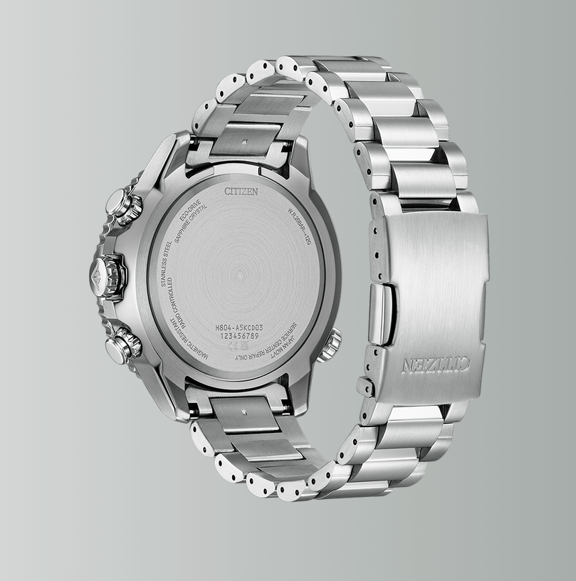 A Citizen especifica um diâmetro de caixa de 48 mm com uma espessura de 13,4 mm. O relógio usa cristal de safira e um sólido fundo de caixa em aço inoxidável. A pulseira também é de aço inoxidável, com elos sólidos e um fecho dobrável assinado visível nas imagens.