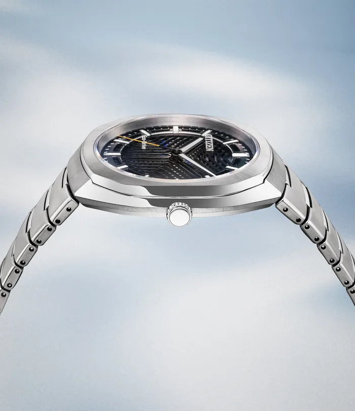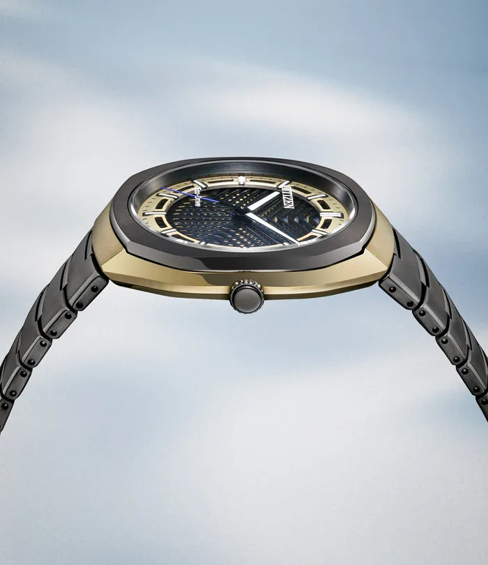O coração desse novo lançamento é o novo mostrador multicamadas. A Citizen usa duas camadas de metal cortadas empilhadas uma sobre a outra, o que cria um padrão semelhante a uma interferência. Abaixo disso, há um filme colorido estrutural colocado acima da célula solar. À medida que a luz passa pelas fendas, o mostrador produz cores variáveis, dependendo do ângulo de visão. O resultado é um efeito 3D visível que muda em tempo real.