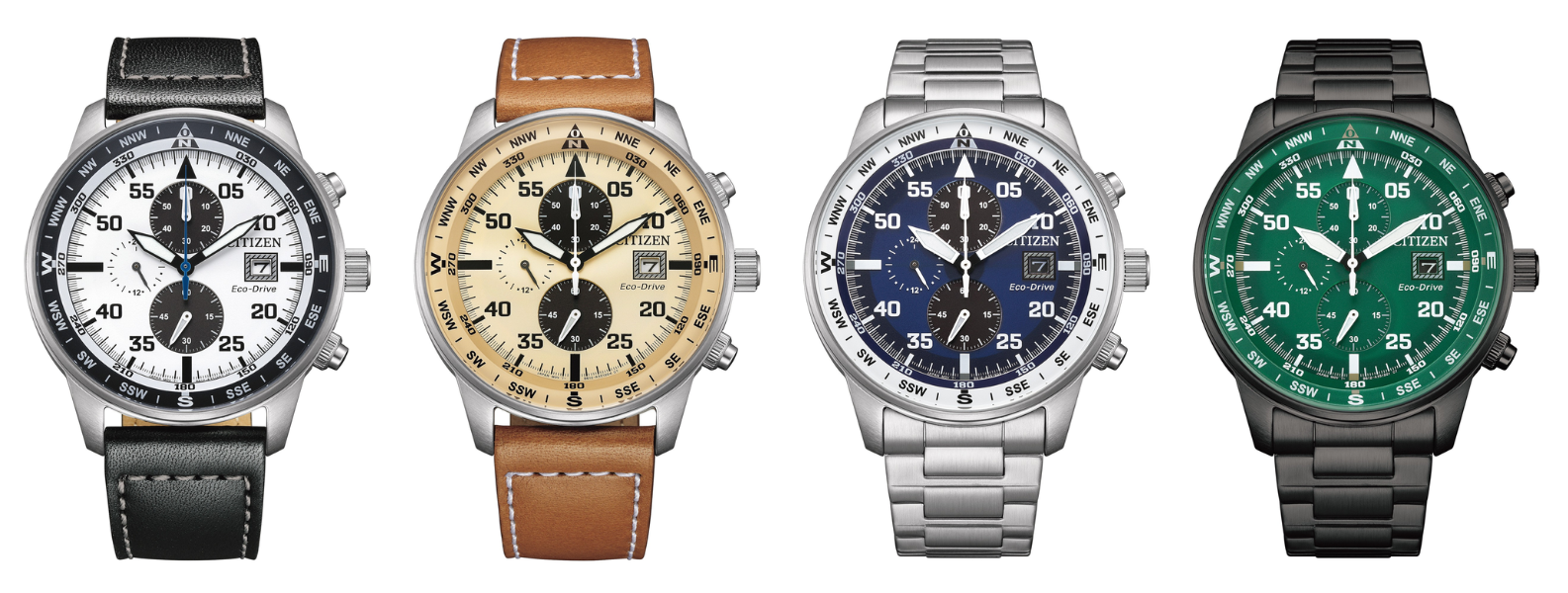 Todos esses relógios da Citizen têm um anel de bússola decorativo e um indicador de data simples. Há três mostradores, um dos quais mostra a hora em um formato de 24 horas, e o outro está ligado à função de cronógrafo. Esses relógios usam o calibre Eco-Drive B612, o que permite que sejam alimentados por luz. Há também recursos como um aviso de carga insuficiente e uma função de prevenção de sobrecarga.