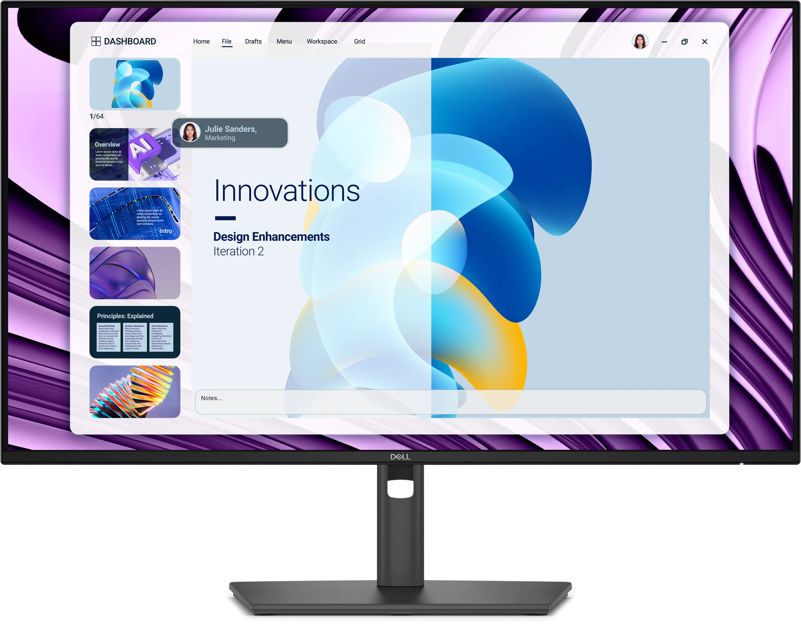 O monitor Dell Pro P 27 USB-C Hub de 27 polegadas tem uma tela IPS com um amplo ângulo de visão de 178° e uma taxa de contraste de 1500:1. Graças ao hardware integrado que ajuda a reduzir as emissões nocivas de luz azul, o monitor tem uma certificação de 4 estrelas da TÜV Rheinland para conforto ocular.