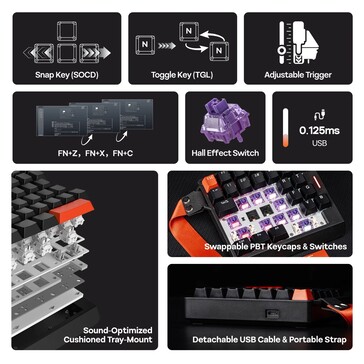 O teclado apresenta uma carcaça de plástico com uma placa de alumínio para aumentar a estabilidade. Os interruptores de efeito Hall foram projetados para uma resposta particularmente rápida das teclas, e o ponto de disparo também é ajustável. A iluminação de fundo RGB e as teclas PBT são padrão. O teclado de 350 gramas vem com uma alça de pulso para facilitar o transporte. O Windows e o Linux são oficialmente compatíveis, mas não o macOS.