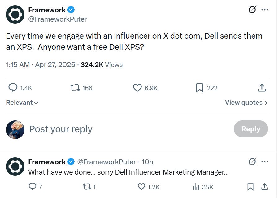 Naturalmente, OEMs de laptops bem estabelecidos parecem estar levando a Framework a sério agora. O Framework afirma que "toda vez que nos envolvemos com um influenciador no X dot com, a Dell envia a ele um XPS". A publicação obteve um tráfego decentecom mais de 320 mil visualizações até o momento da redação deste artigo. Isso fez com que muitas pessoas pedissem ao Framework, em tom de brincadeira, para interagir com elas na esperança de receber um XPS da Dell.
