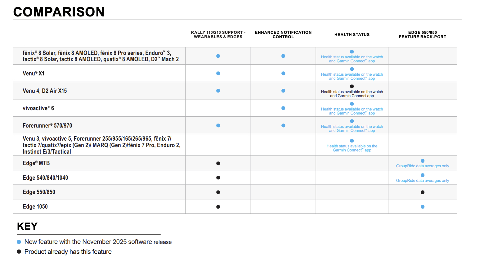 Quanto ao restante da mais recente atualização de recursos da Garmin, muitos são consignados à sua série de computadores de ciclismo, como o Smart Fueling e a análise da relação de marchas. Dito isso, a Garmin também está oferecendo controle de notificação aprimorado no Fenix 8, Forerunner 970, Venu 4 e Venu X1, entre outros smartwatches associados. Além disso, a Garmin adicionou o suporte Rally 110 e Rally 210 para vários wearables também, com a atualização de recursos de novembro de 2025, como mostra a imagem acima.