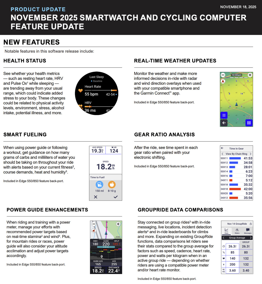 A Garmin afirma estar emitindo sua atualização de recursos de novembro de 2025 gradualmente. Portanto, pode levar mais algumas semanas até que as atualizações de software correspondentes cheguem aos computadores de ciclismo e smartwatches elegíveis. Infelizmente, a Garmin ainda não confirmou os números de compilação das atualizações de software relevantes.