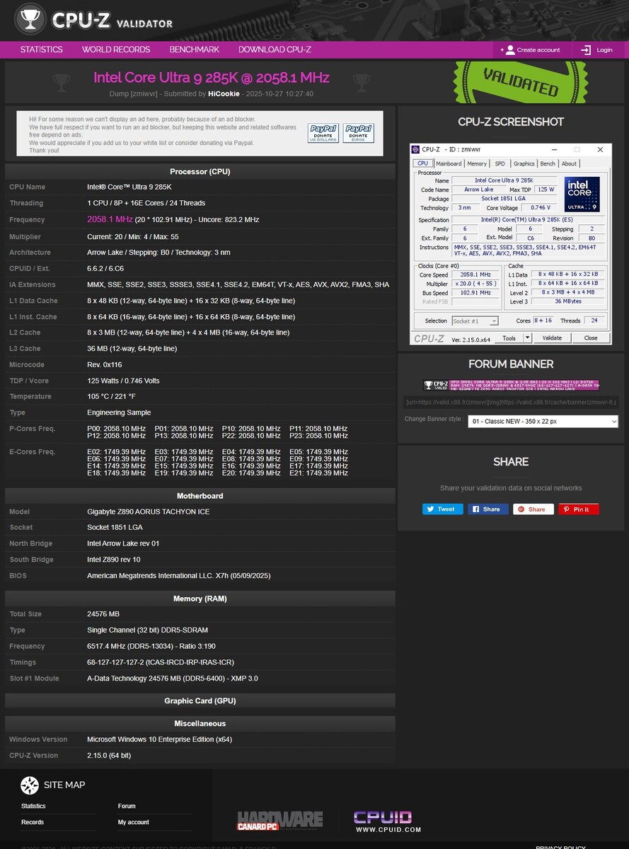 Hicookie declarou: "13K alcançados! Agradeço imensamente à ADATA Technology pela memória excepcional e ao Core Ultra 285K da Intel - seu controlador de memória é fenomenal. Em conjunto com a GIGABYTE Z890 AORUS TACHYON ICE, levamos a DDR5 para além de 13.000 MT/s."