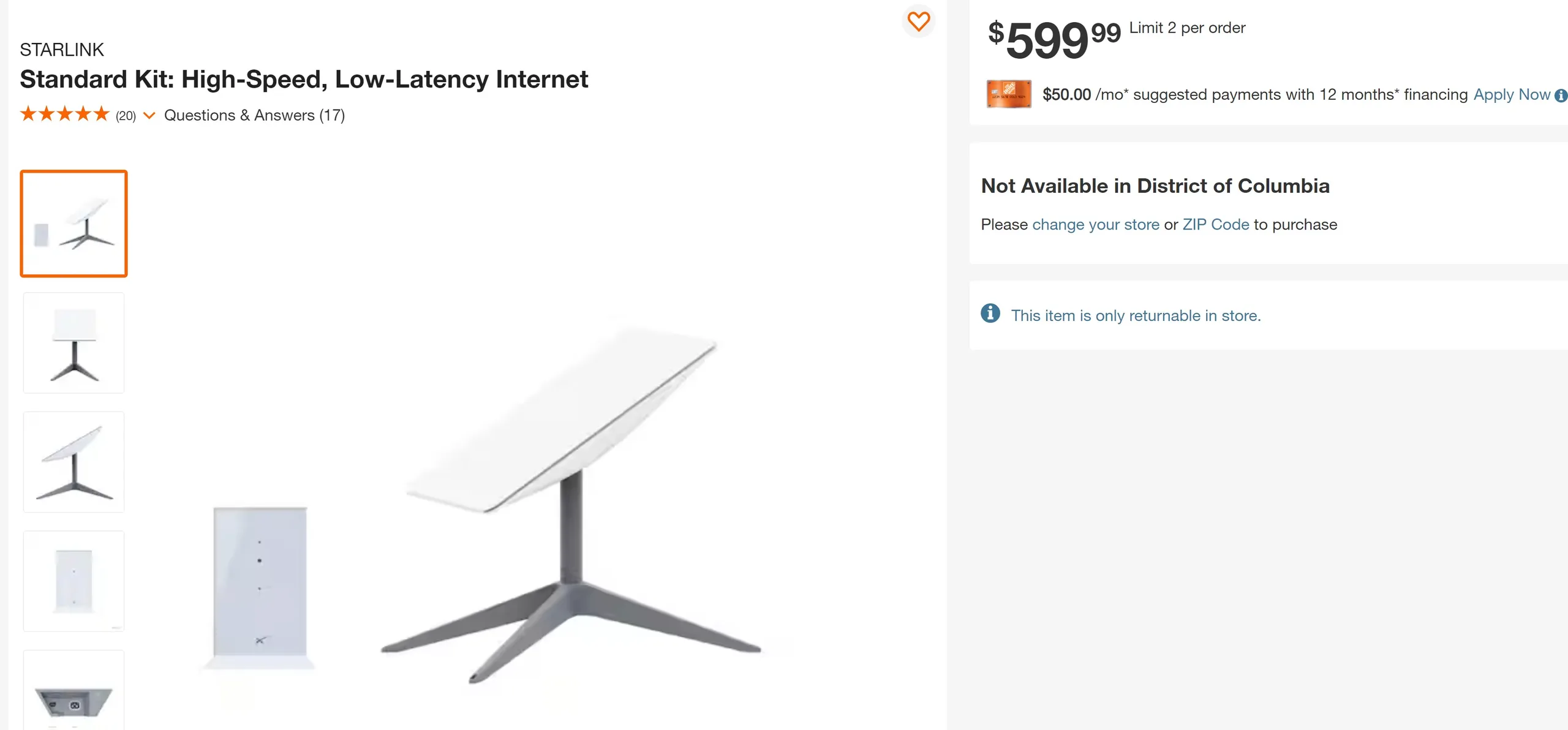 O conjunto completo Starlink necessário para acessar a constelação de Internet via satélite da SpaceX de Elon Musk já está disponível na Home Depot. A gigante varejista de artigos para a casa está vendendo a antena parabólica e o roteador pelo mesmo preço de US$ 599 que a SpaceX está vendendo em sua própria loja virtual, ao qual também acrescenta custos de envio e manuseio.