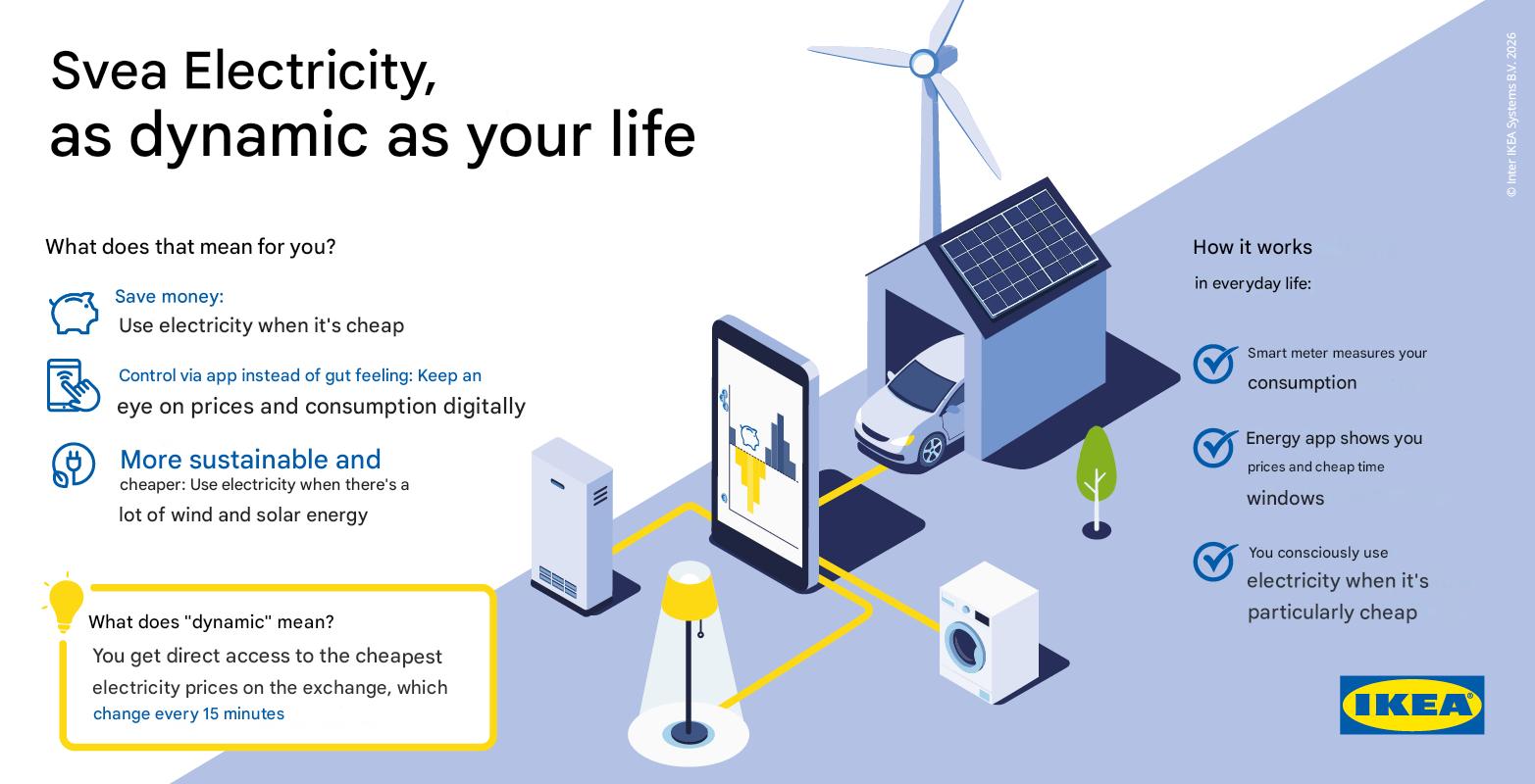 A Svea Solar estima que os clientes da Svea Strom poderiam economizar mais de 600 euros por ano. É cobrada dos clientes uma taxa mensal básica de € 6,99. No entanto, os membros da IKEA que se inscreverem antes de 1º de fevereiro não precisarão pagar essa taxa nos primeiros seis meses. Depois disso, os membros da IKEA Family e da IKEA Business Network pagarão uma taxa reduzida de €5,95. Não há prazo mínimo de contrato, embora haja o incentivo de um voucher de 25 euros da IKEA para os clientes que permanecerem por seis meses. Outros benefícios incluem a instalação gratuita de medidores inteligentes, se obrigatório, e o aplicativo Svea Solar também é gratuito. Não está claro se ou quando a tarifa dinâmica Svea Strom da IKEA x Svea Solar poderá chegar a outros países.