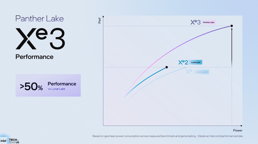Em relação ao desempenho, a Intel fez algumas afirmações grandiosas sobre o desempenho da iGPU do Panther Lake. Ela afirma oferecer um aumento de desempenho de até 50% em relação ao Lunar Lake e um aumento de 40% no desempenho por watt. Como sempre, esses são benchmarks originais e devem ser tratados com ceticismo até que surjam mais dados.