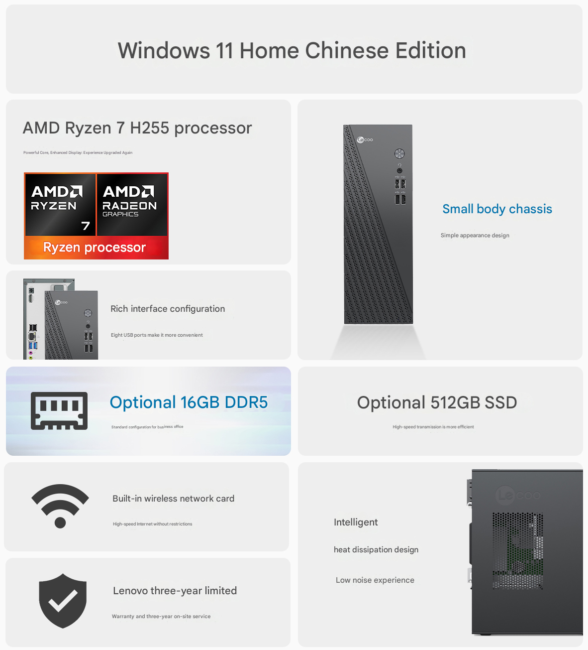 O Lecoo Cool 310 parece ter sido atualizado, já que a Lenovo adicionou duas novas opções de CPU para o mini PC. O Ryzen 7 H 255 é uma delas, que é basicamente uma APU exclusiva da China, baseada no Ryzen 7 8745H.