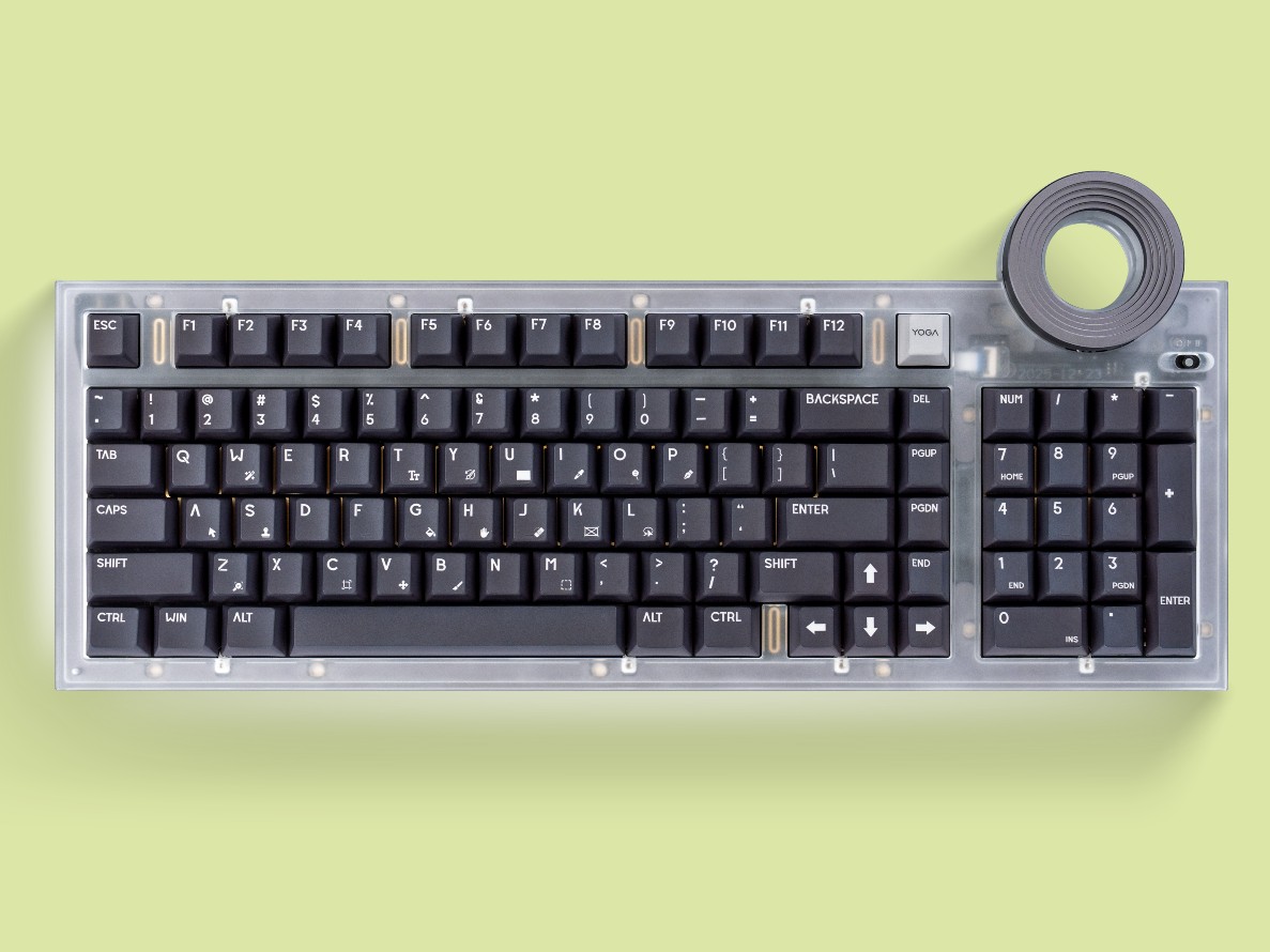 O Yoga Creative Keyboard AngryMiao Edition é um teclado mecânico teclado mecânico com um toque criativo, pois tem um botão grande no canto superior direito. Esse botão, que fornece feedback tátil, pode ser personalizado para servir como uma roda de rolagem ao navegar na Web ou para esfregar ao usar um software de edição de vídeo ou áudio.