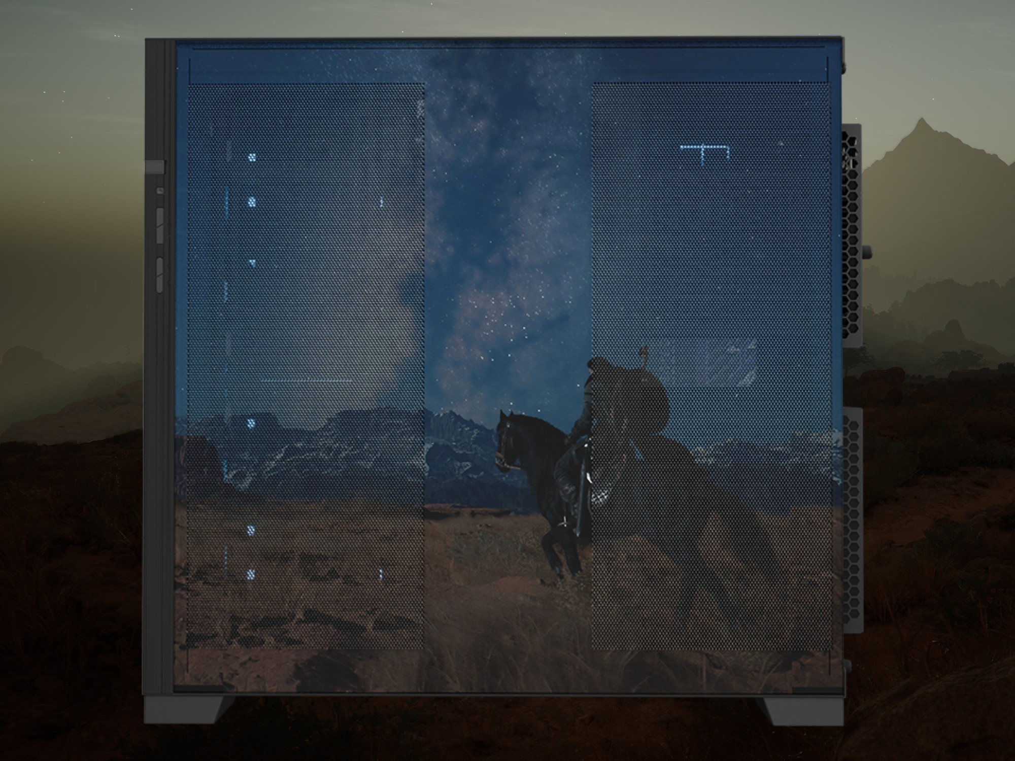 Apesar de os gráficos envolverem o chassi de vidro temperado, os componentes permanecem visíveis. Eles incluem um resfriador líquido de 360 mm com iluminação RGB e um trio de ventoinhas. Menos perceptível é o SSD de 2 TB Gen M.2 NVMe instalado na placa-mãe Placa-mãe X870E.