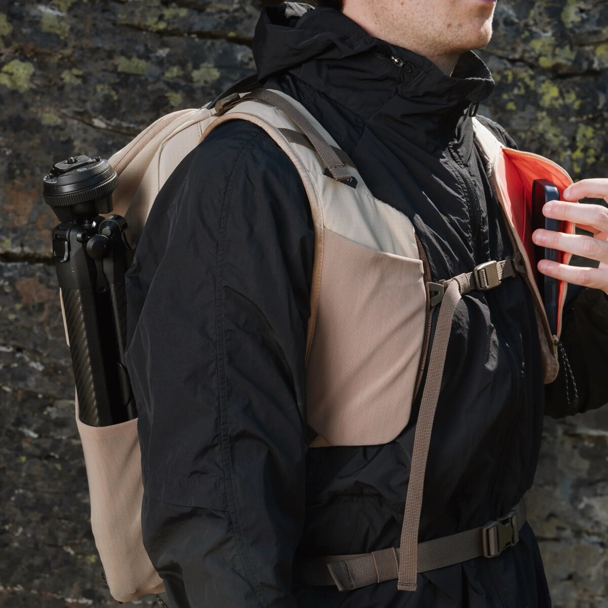 A Moment também anunciou o colete para câmera Exposure 10L, que cabe sobre uma camisa e oferece vários bolsos pequenos. O Exposure 10L inspira-se nos coletes de corrida e permite acesso rápido a acessórios como pequenos tripés, câmeras compactas, baterias ou flashes. Um bolso maior na parte de trás pode acomodar uma bolsa de água com um tubo para beber ou um laptop de 14 polegadas.