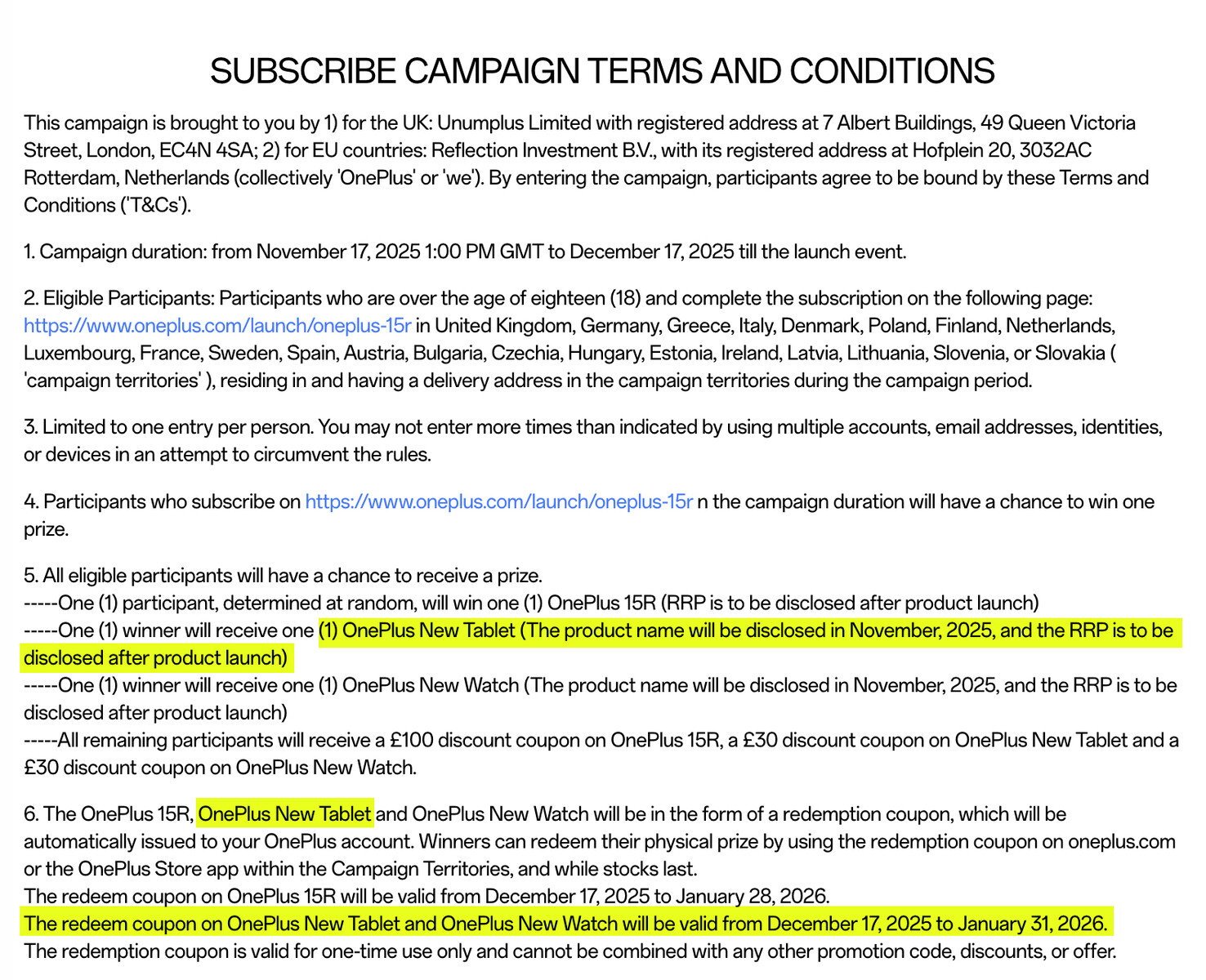 Em vez disso, a OnePlus menciona um "OnePlus New Tablet" nos termos da campanha promocional do OnePlus 15R. Como mostra a captura de tela abaixo, a OnePlus revelará o nome desse misterioso tablet no final deste mês. Além disso, os mesmos termos indicam que a OnePlus lançará o mesmo tablet por volta de 17 de dezembro, antes que sua campanha antecipada termine em 31 de janeiro de 2026.