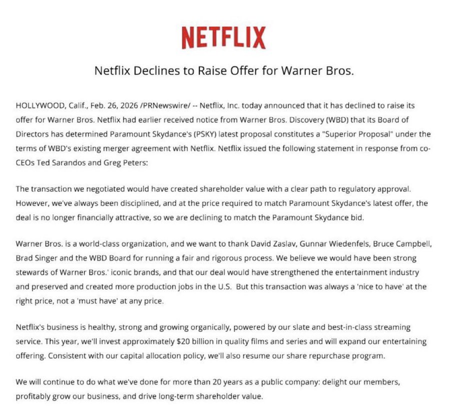 Em 5 de dezembro de 2025, Netflix publicou um anúncio oficial segundo o qual a plataforma de streaming negociou e financiou totalmente um acordo definitivo para adquirir a Warner Bros. incluindo seus estúdios de cinema e televisão, HBO Max e HBO. A transação em dinheiro e ações foi avaliada em US$ 82,7 bilhões (valor patrimonial de US$ 72 bilhões). Entretanto, na verdade, esse não foi um acordo definitivo, pois a licitação para a WBD permaneceu aberta, com a Paramount Skydance continuou a fazer ofertas nesse meio tempo. Em 26 de fevereiro, o conselho da Warner Bros. Discovery considerou a última oferta da Paramount "superior" ao acordo inicial da Netflix. Com essa oferta superior, a Paramount Skydance adquiriria 100% da WBD por aproximadamente US$ 111 bilhões. A Netflix se recusou a contra-atacar com uma oferta mais alta e a Paramount agora parece estar pronta para possuir completamente a WBD.
