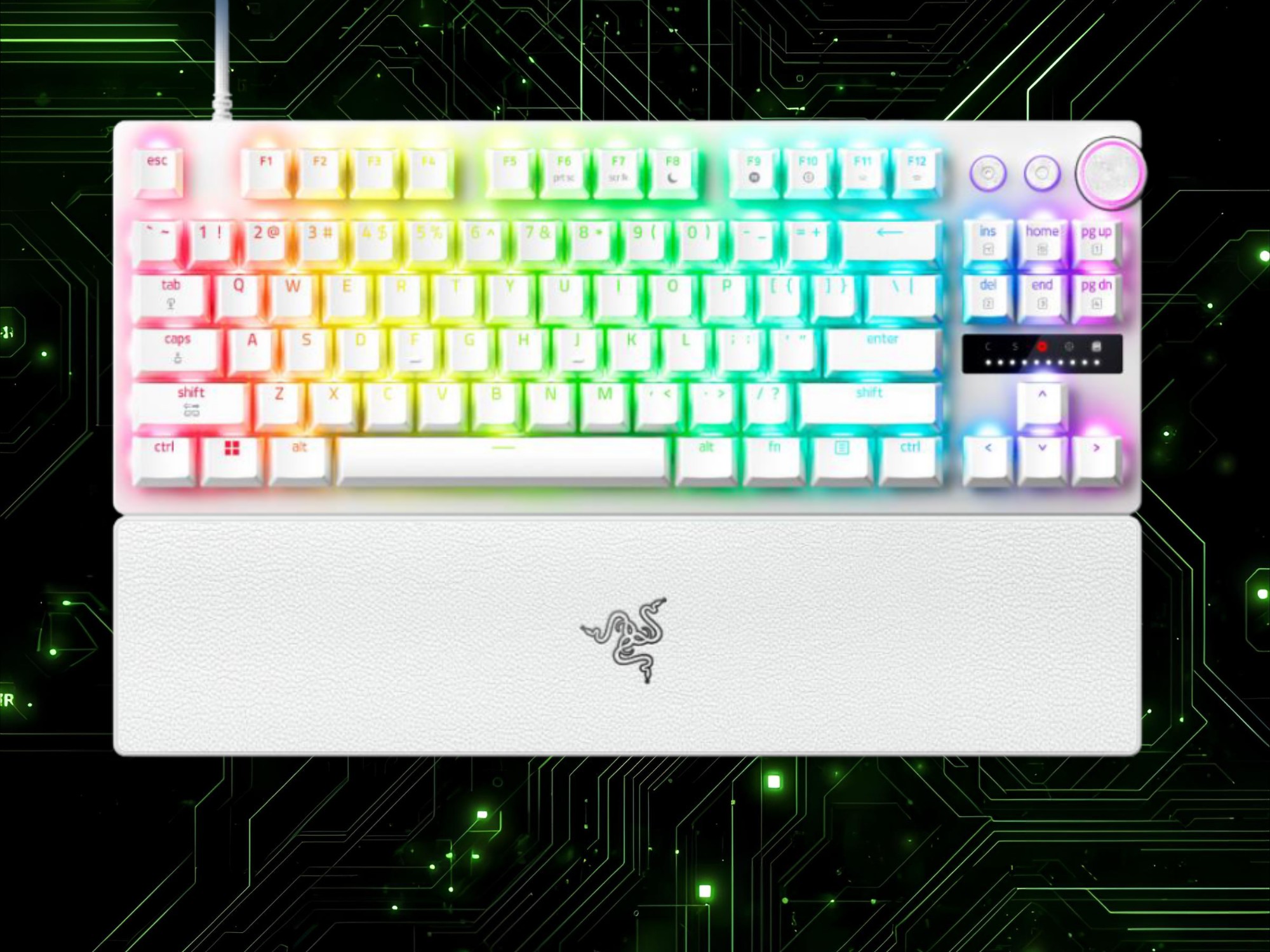 O teste prático do modelo TKL confirmou que ele reage a um leve toque. Entretanto, com uma faixa de atuação de 0,1 mm a 4 mm, as configurações mais altas o tornam mais prático para tarefas de produtividade. Os jogadores também podem ajustar outras opções, como Snap Tap e Rapid Trigger, sem precisar do Synapse 4. O lado direito do teclado com fio apresenta controles de mídia remapeáveis e vários indicadores LED.