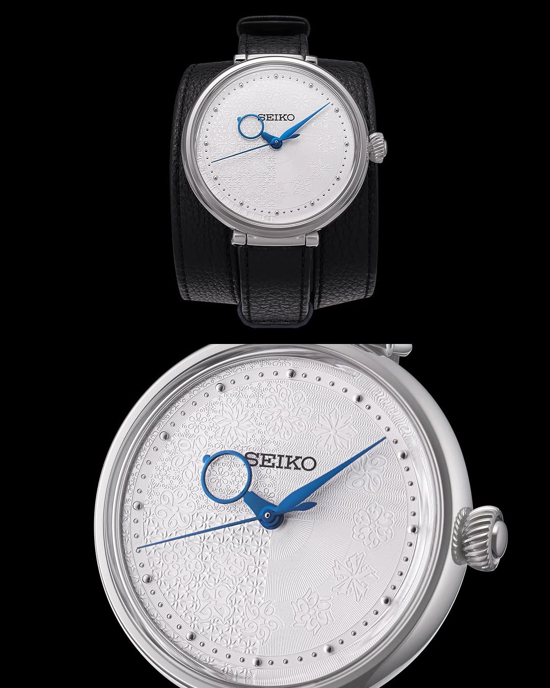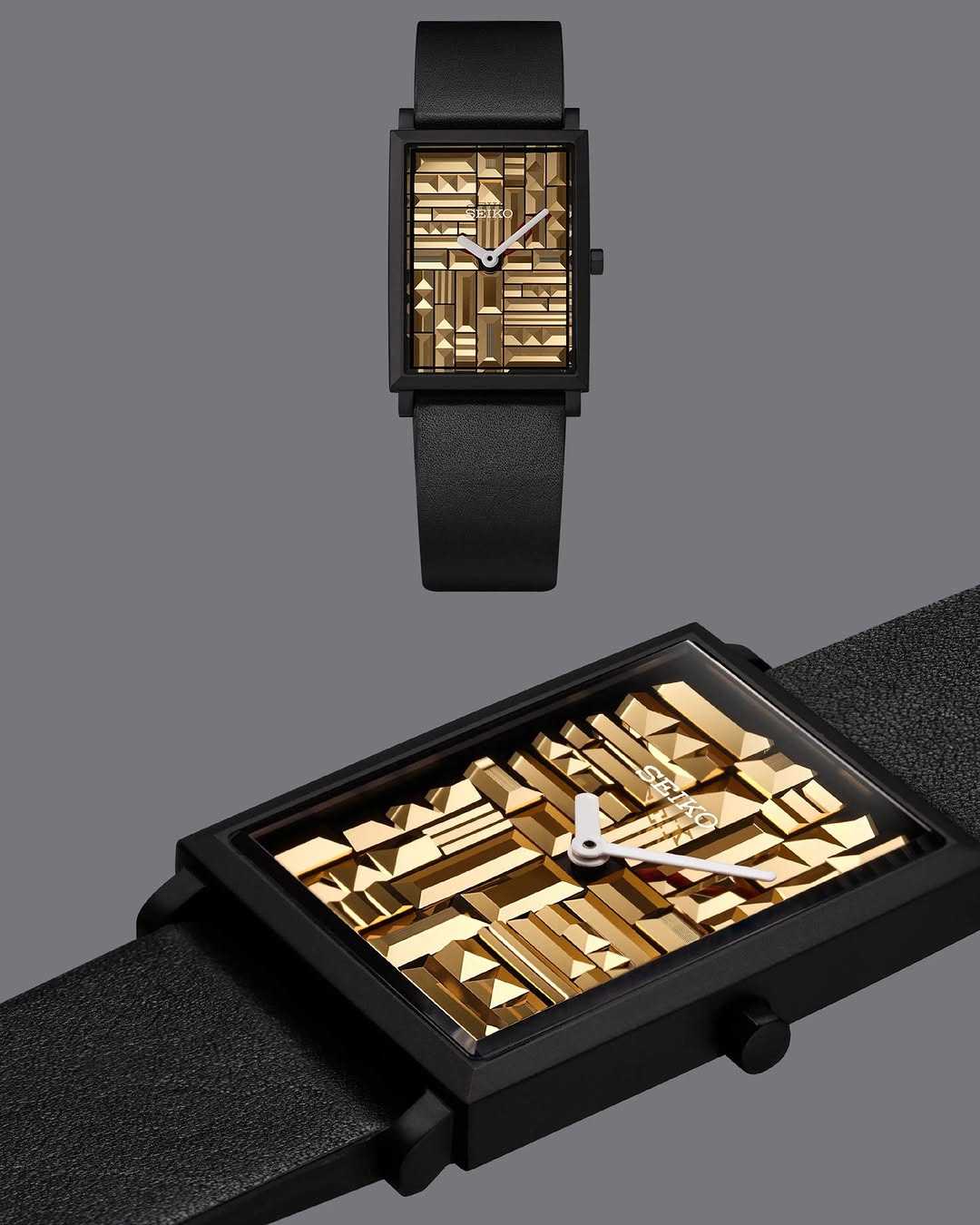 Outro modelo do diretor de design Yu Ishihara apresenta geometria esférica. Sua caixa arredondada se curva suavemente da frente para trás, e a própria superfície usa uma combinação de acabamentos polidos e escovados para acentuar a forma do metal. O terceiro relógio, desenhado por Takuya Matsumoto, conhecido por seu trabalho nas linhas premium da Seiko, tem tudo a ver com as texturas do mostrador. O mostrador é dividido em quatro quadrantes inspirados em imagens sazonais, como os rios da primavera, o sol do verão, o céu do outono e a neve do inverno.