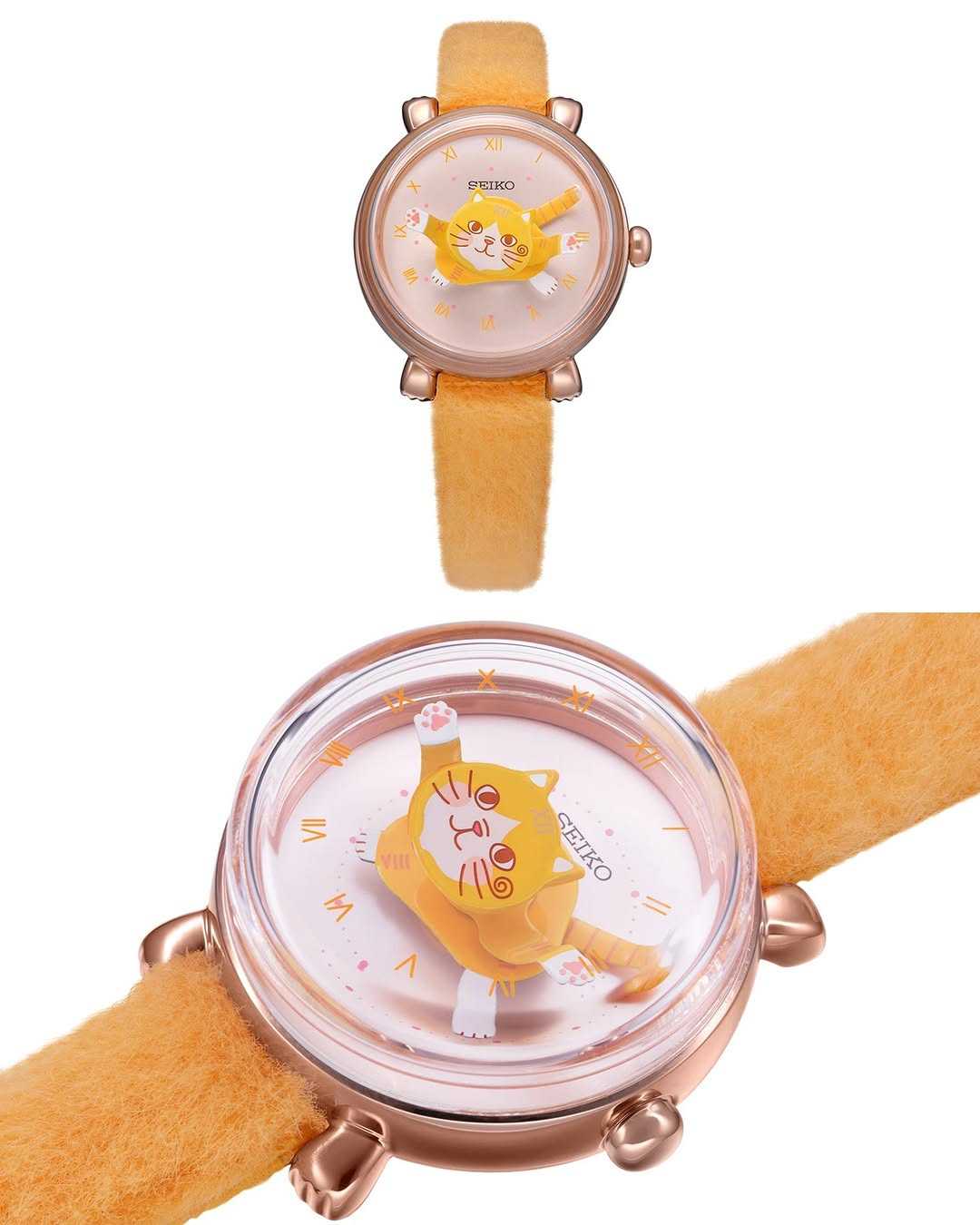A última peça é a mais divertida, com um gato chamado Ten-chan, criado pelo designer Yuki Omori. O relógio usa o corpo do gato como mostrador das horas, com a cauda indicando as horas, as patas marcando os minutos e os ponteiros atuando como indicador dos segundos. As hastes da caixa parecem patas, com detalhes de almofadas de patas na parte inferior da mesma.
