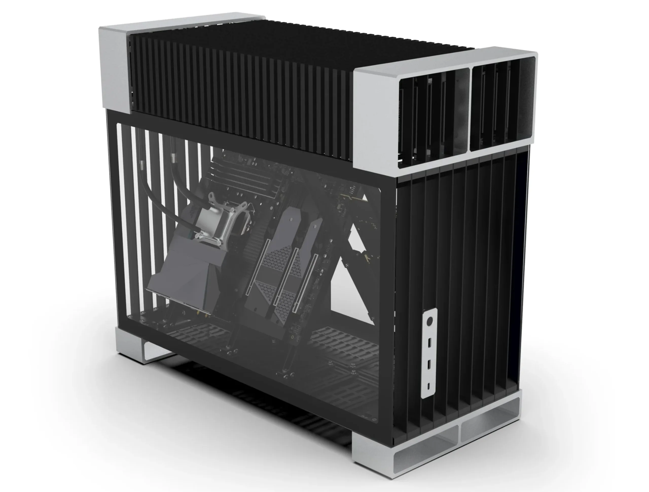 O gabinete SG10 sem ventoinha da Streamcom pode resfriar com eficiência uma CPU de 250 W e uma GPU de 350 W, o que o torna ideal para um i7-13900K e uma RTX 4080 com alguns ajustes de subvoltagem. Esse gabinete tem uma orientação horizontal, com dois grandes dissipadores de calor de alumínio na parte superior, um para a CPU e outro para a GPU. Para alcançar um potencial de dissipação tão alto, o design da Streamcom combina o tradicional resfriamento por heatpipe com AIO com elementos AIO, com tubos de cobre e tubos de loop duplo. Os tubos e as tubulações fazem circular o líquido de arrefecimento que passa por um ciclo de evaporação e condensação, fazendo com que todo o sistema funcione como um resfriador de líquido sem bomba.
