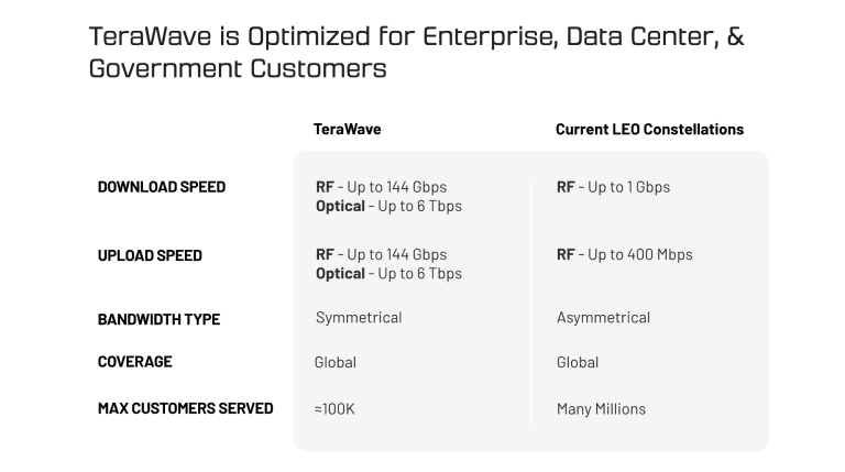 A Blue Origin, de Jeff Bezos, anunciou https://www.blueorigin.com/news/blue-origin-introduces-terawave-space-based-network-for-global-connectivity TeraWave, uma rede de Internet via satélite projetada para fornecer até 6 terabytes por segundo de largura de banda simétrica e voltada diretamente para clientes corporativos, de data center e governamentais. Diferentemente da Starlinkque atende a milhões de usuários individuais, a TeraWave tem como alvo uma base de clientes muito menor.