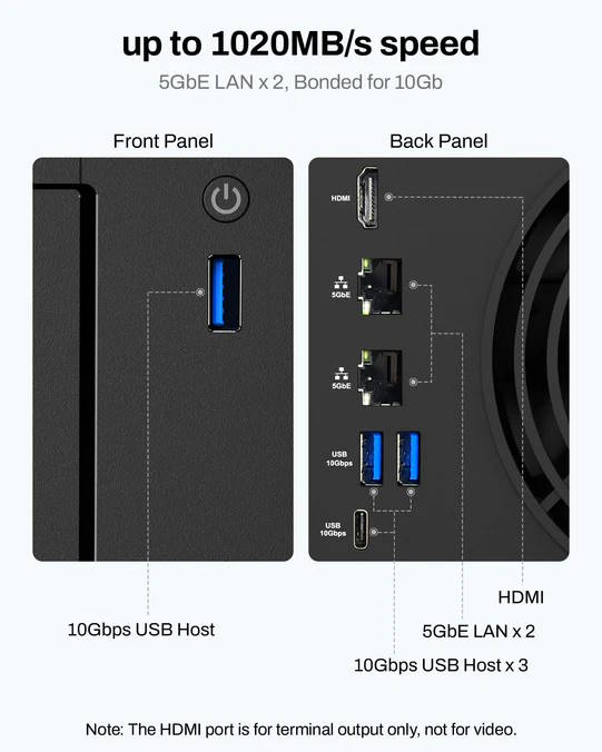 Uma única saída HDMI está disponível para conexão a um monitor externo. Ambos os dispositivos NAS suportam o Docker, permitindo que os usuários executem uma ampla variedade de aplicativos. Eles também oferecem opções de segurança abrangentes e integração de serviços em nuvem. O último recurso oferece aos usuários a opção de fazer backup de seus dados no armazenamento em nuvem, além dos dispositivos locais, para maior proteção.