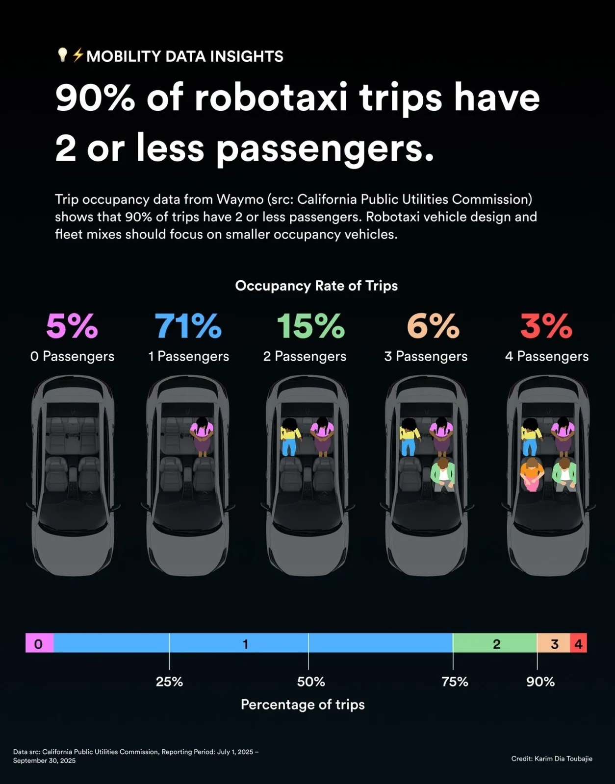 O conceito de dois lugares foi agora justificado pelas estatísticas mais recentes sobre as taxas de ocupação da Waymo. Acontece que 90% das viagens sem motorista realizadas em um robotáxi são feitas com uma ou duas pessoas. A grande maioria dessas viagens também é feita com apenas uma pessoa, enquanto apenas 9% incluem pelo menos uma pessoa nos assentos dianteiros.