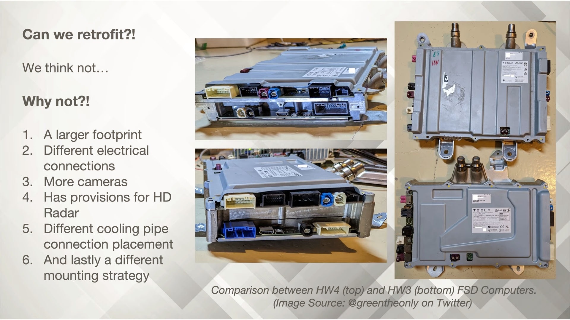 Não está claro se as atualizações do HW3 serão gratuitas, pois Musk disse apenas que"também ofereceremos a possibilidade de atualizar o carro para substituir o computador", mas ainda não se sabe se essa opção será gratuita ou não, pois o outro conselho que a Tesla dá é comprar um carro mais novo com algum tipo de desconto não especificado.