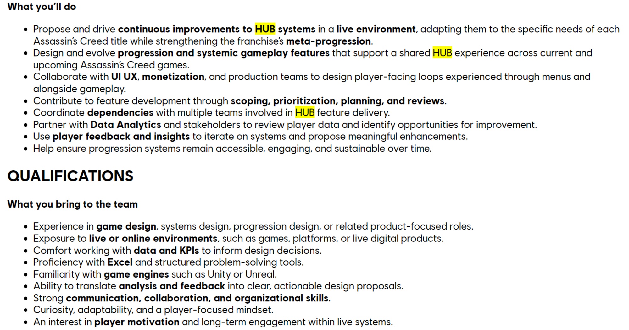 Baseado na cidade de Quebec, o desenvolvedor otimizaria a progressão e os sistemas nos jogos Assassin's Creed. Fazendo referência ao lançador Animus Hub, que conecta vários títulos, o anúncio de emprego pede "melhorias contínuas nos sistemas HUB em um ambiente ao vivo"
