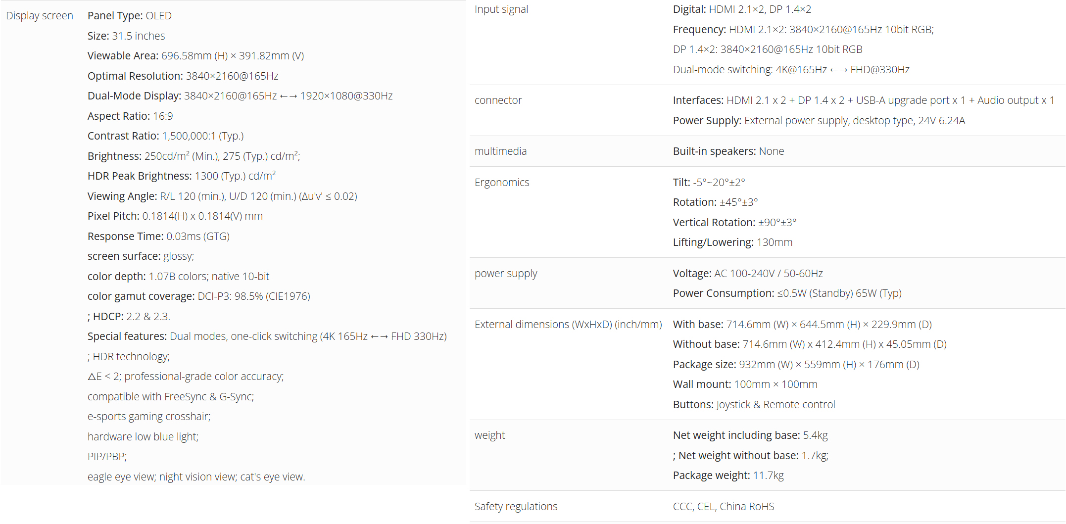 Embora o monitor para jogos mais novo mantenha um painel OLED com modos duplos, ele pode oferecer uma taxa de atualização de 330 Hz no modo de resolução de 1080p e uma taxa de atualização de 165 Hz em 4K. Para comparar, o XG323-4K-OLED2 que foi lançado no ano passado, pode chegar a 480 Hz no modo FHD e 240 Hz em 4K.