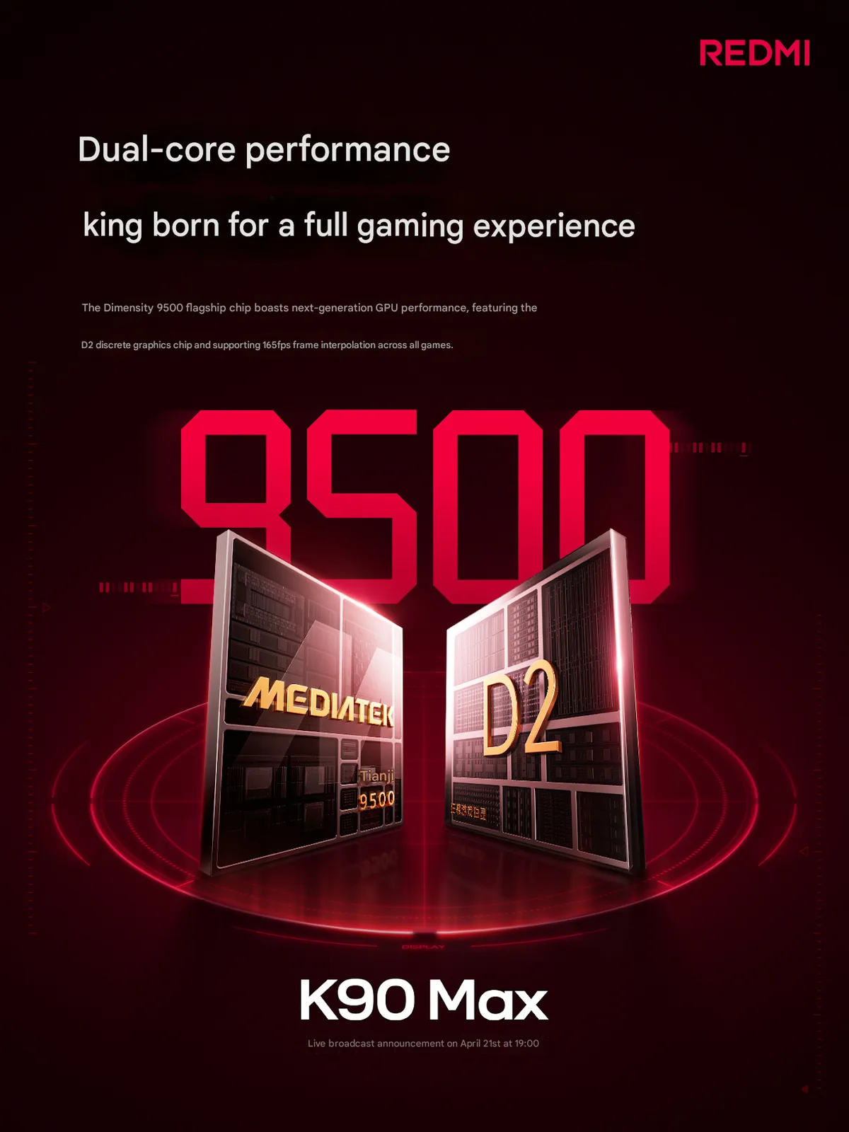 Como a Xiaomi confirmou, o Redmi K90 Max será equipado com o Dimensity 9500, O atual SoC carro-chefe da MediaTek. Ele será emparelhado com o chipset gráfico D2 dedicado. Juntamente com o cooler ativo, essa combinação promete oferecer "experiência de jogo de alto nível"