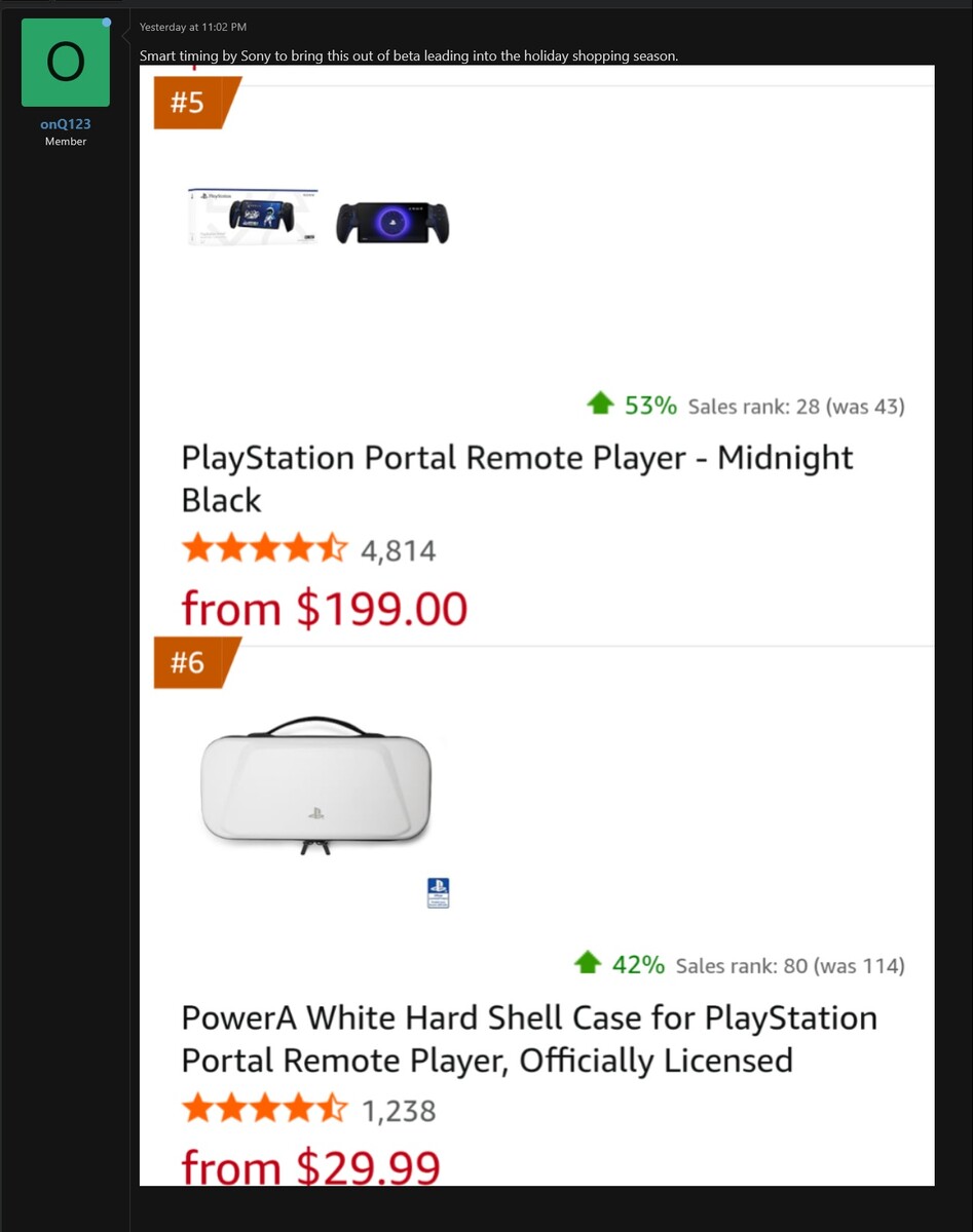 Com o valor agregado, o preço sugerido de US$ 199,99 do dispositivo móvel da Sony parece mais competitivo. No fórum NeoGafonQ123 notou que o Portal saltou do 43º para o 28º lugar no ranking de videogames da Amazon. Os acessórios essenciais do PlayStation Portal, como estojos de transporte, também estão em alta demanda.
