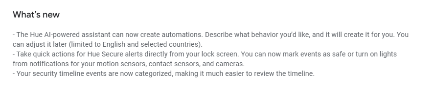 Na versão 5.55, a Philips Hue adiciona mais melhorias para o Hue AI Assistant. Agora, o senhor pode usar essa ferramenta para criar automações, descrevendo o comportamento pretendido para o bot. O assistente gerará a automação relevante, que pode ser ajustada manualmente pelo usuário. É importante observar que o Hue AI Assistant só está disponível quando o idioma do aplicativo está definido como inglês e ainda não está disponível em todos os países.
