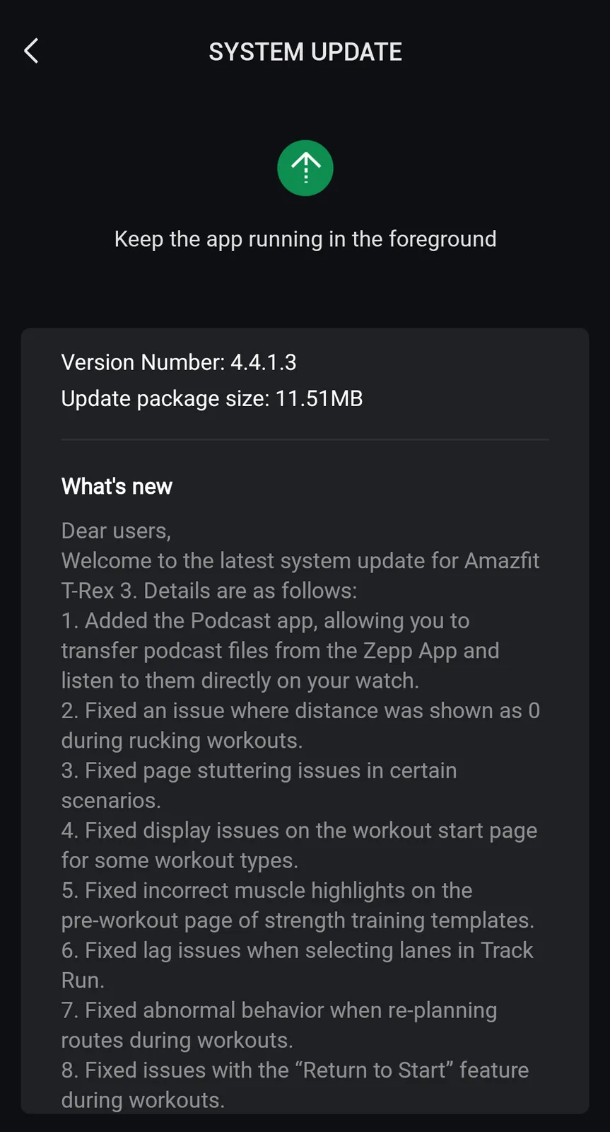 A versão mais recente para o Amazfit T-Rex 3 Pro, versão de firmware 4.4.1.3, é um arquivo de 11,51 MB. Relatado por vários usuários, ele adiciona um novo aplicativo de podcast a esse smartwatch, permitindo que os usuários ouçam os episódios baixados diretamente do wearable. Para fazer isso, os usuários precisarão transferir os podcasts selecionados do aplicativo para smartphone Zepp.
